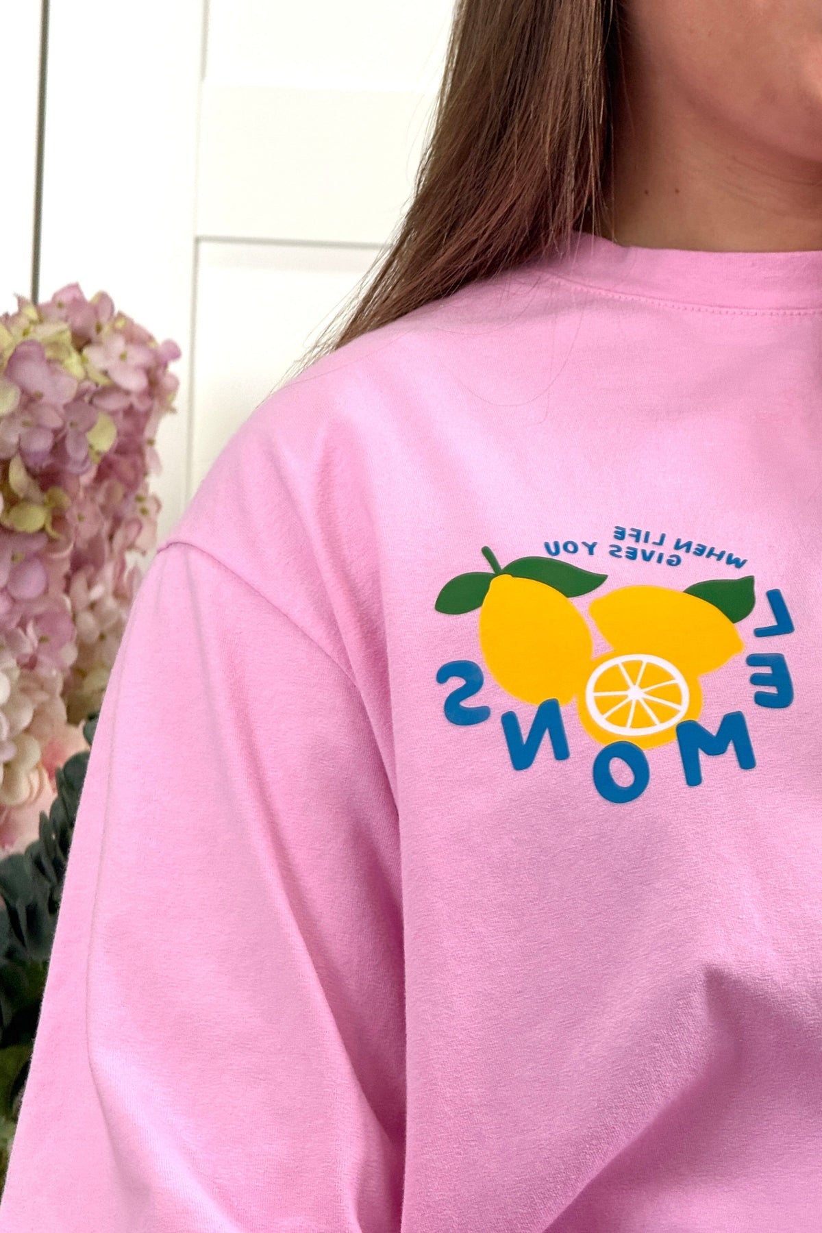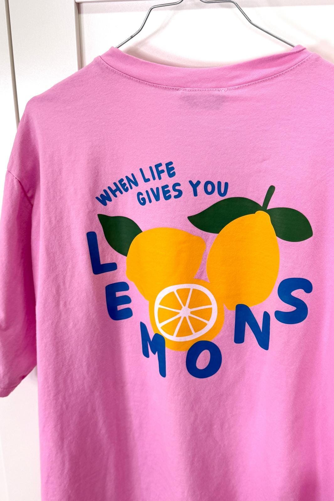 Różowa koszulka od A-bee z graficznym nadrukiem cytryny i napisem WHEN LIFE GIVES YOU LEMONS. Koszulka ma krótkie rękawy i okrągły dekolt.