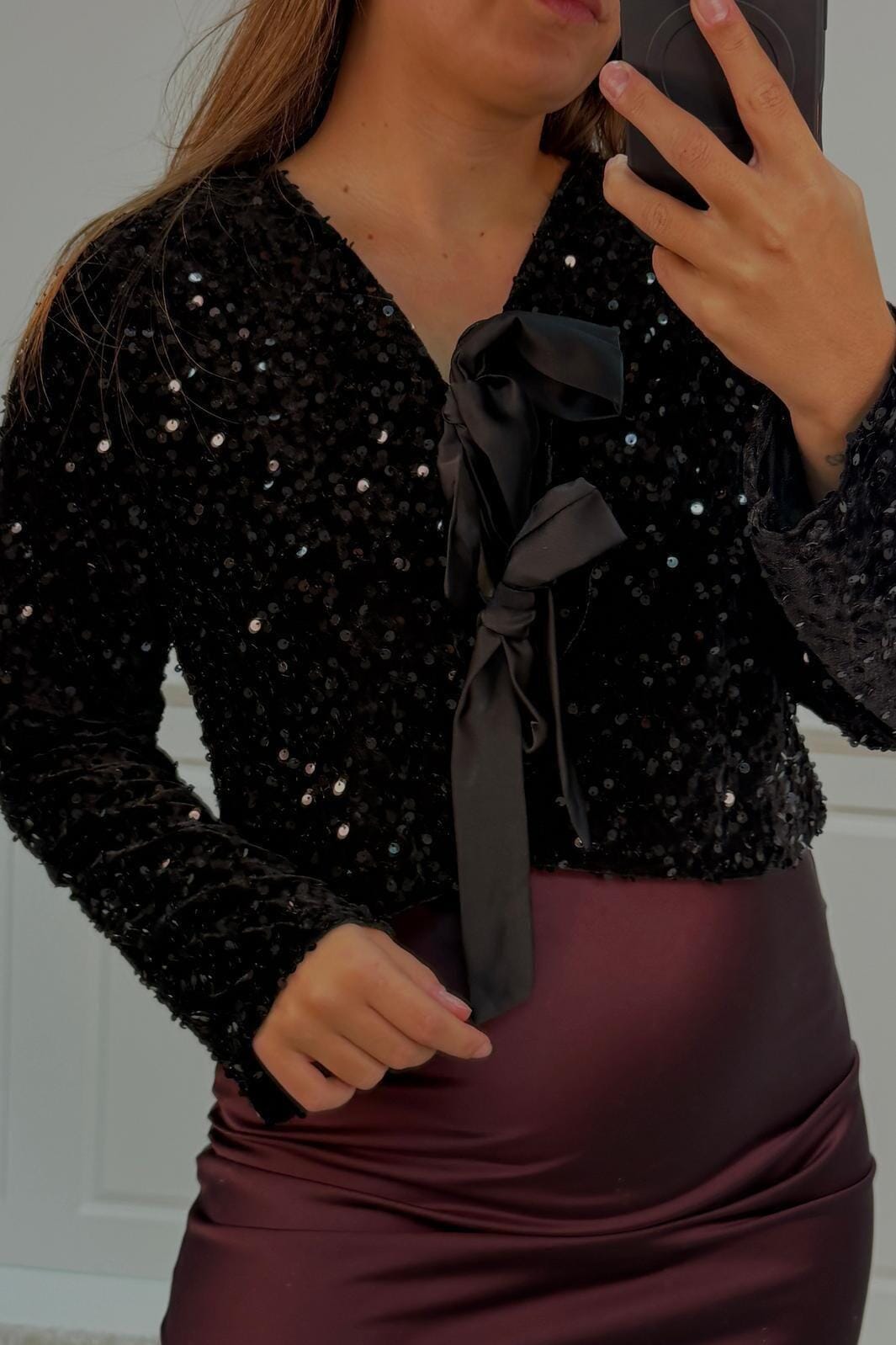 Czarna bluzka od A-bee z cekinami i detalami w postaci kokard. Bluzka ma dekolt w kształcie V z zapięciem na sznurki i długie rękawy. Błyszcząca powierzchnia i dekoracyjne kokardy sprawiają, że nadaje się na uroczyste okazje.