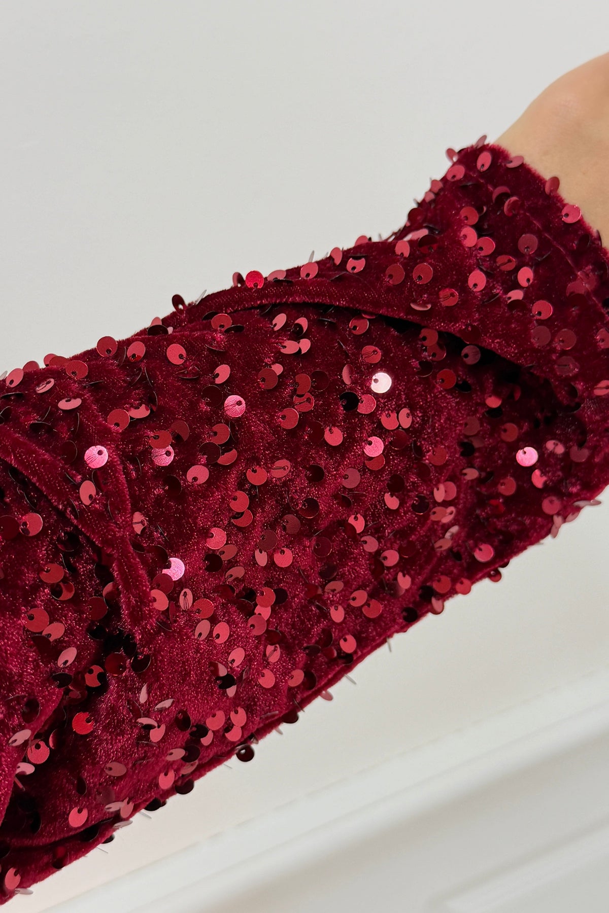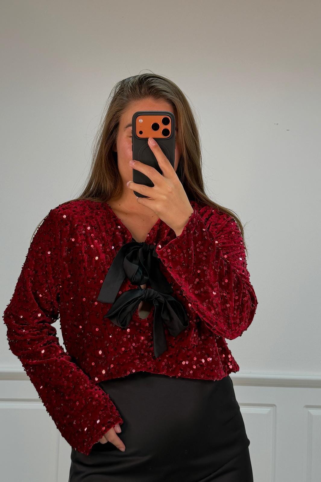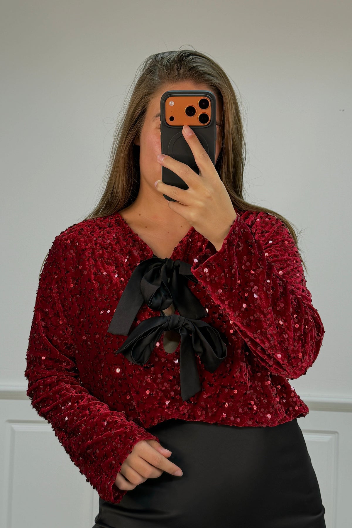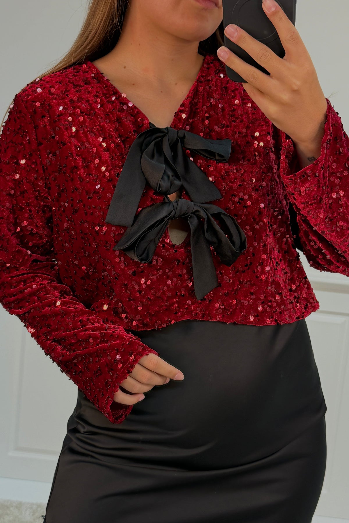 Bordowa bluzka od A-bee z cekinami na całej powierzchni. Ma długie rękawy, dekolt w serek i czarną kokardę przy szyi. Bluzka zapinana jest na sznur i ma standardowy krój.