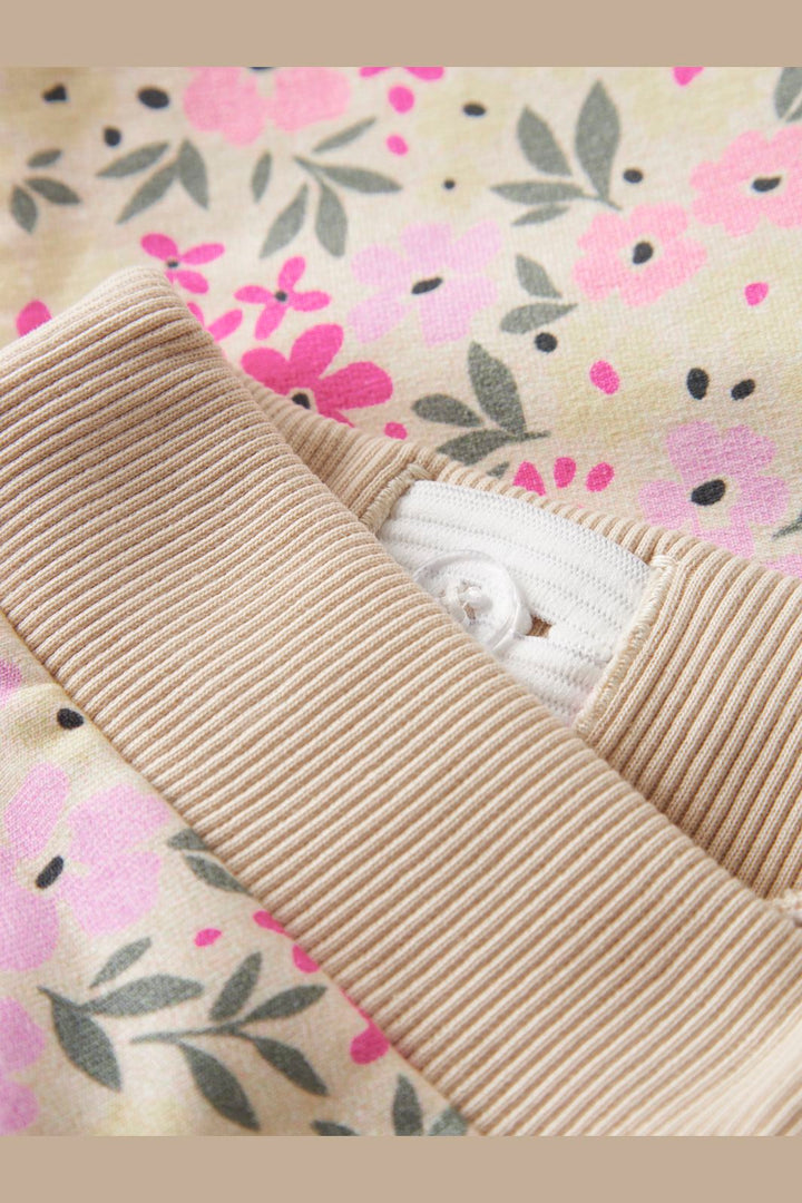 Różowy szalik od A-bee z wzorem kotów i kwiatów. Szalik ma jasnoróżowe tło z czarnymi i białymi detalami w postaci stylizowanych kotów i kwiatów.