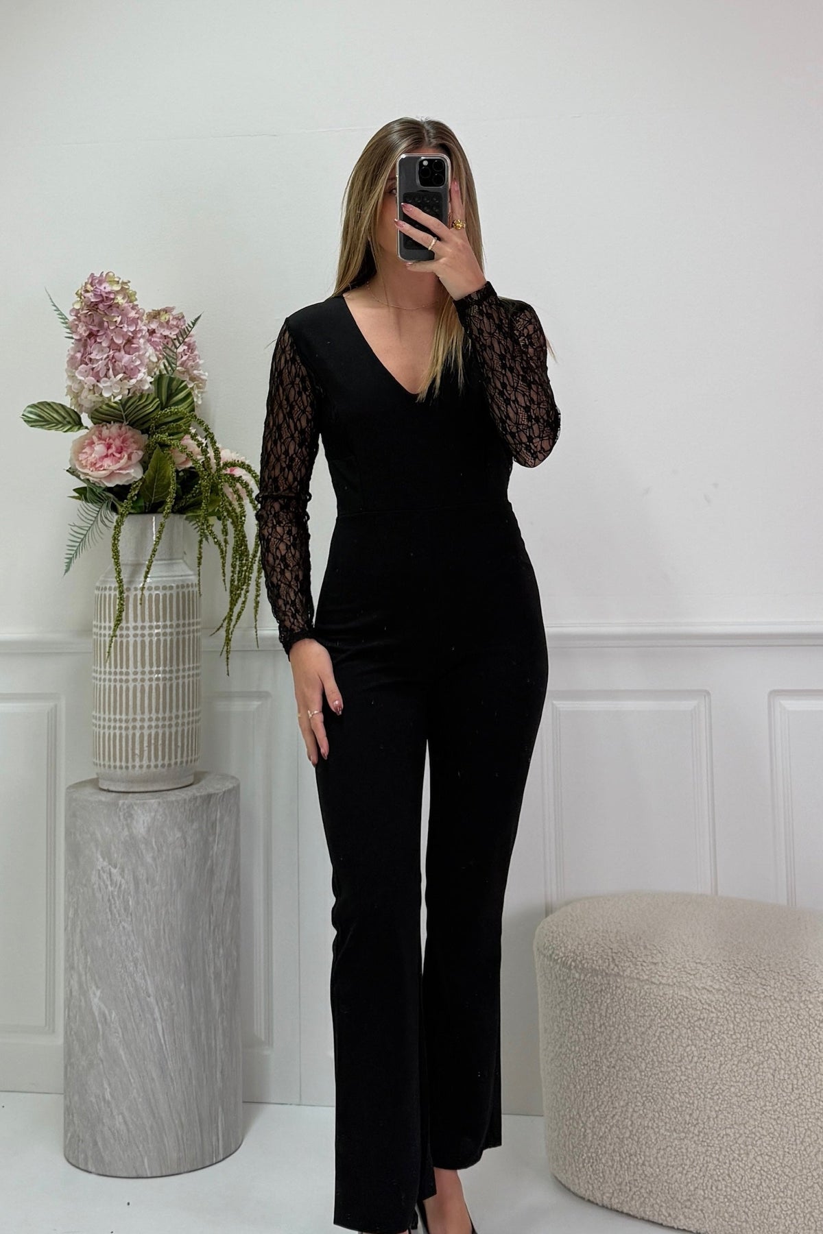 Czarny kombinezon A-bee z koronką i dekoltem w kształcie litery V. Kombinezon ma długie rękawy i sięga do połowy łydki.