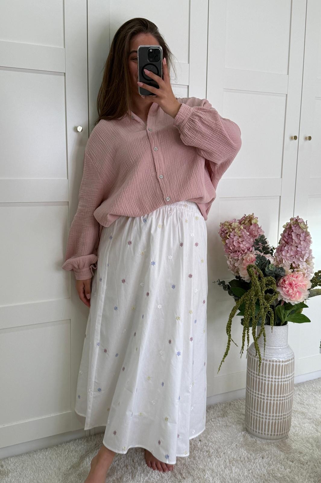 Biała spódnica od A-bee z haftowanymi kwiatami w kolorze fioletowym, żółtym i różowym. Ma luźny krój i długość do kolan, co sprawia, że nadaje się zarówno na co dzień, jak i na imprezy.