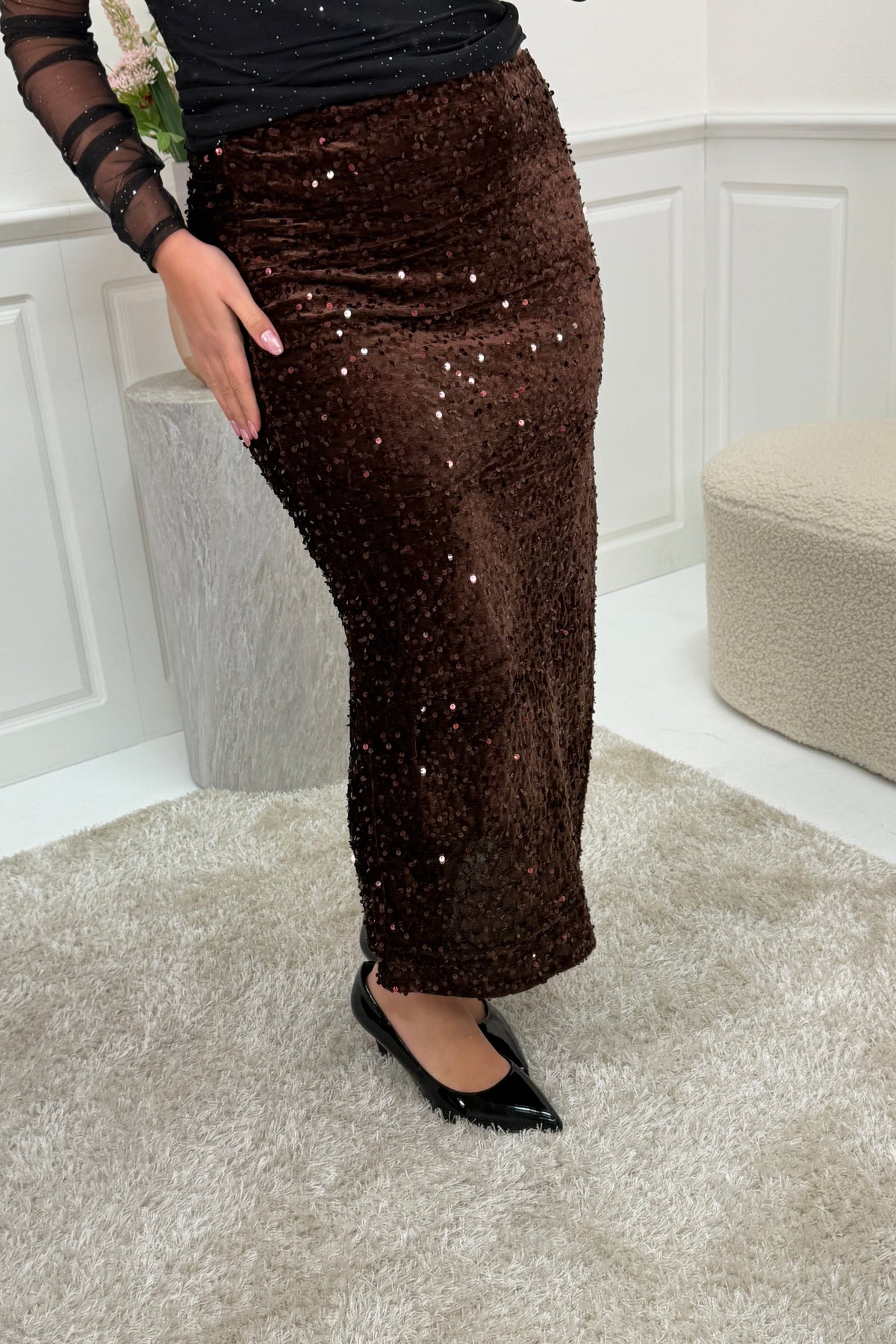 Spódnica od A-bee w ciemnym bordo, pokryta cekinami na całej powierzchni. Wysoki stan i dopasowany krój sięgają do kostek.
