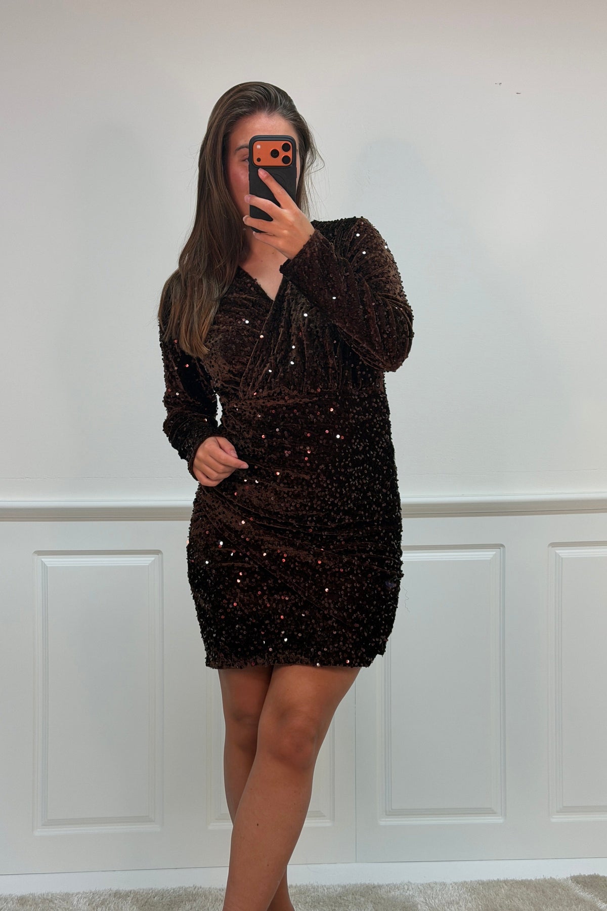 Ciemnobrązowa sukienka od A-bee z cekinami na całej powierzchni. Sukienka ma dopasowany krój i sięga do połowy uda.