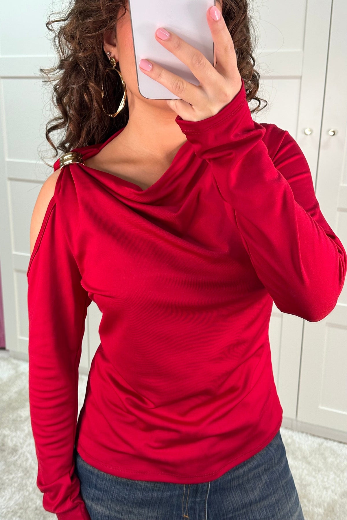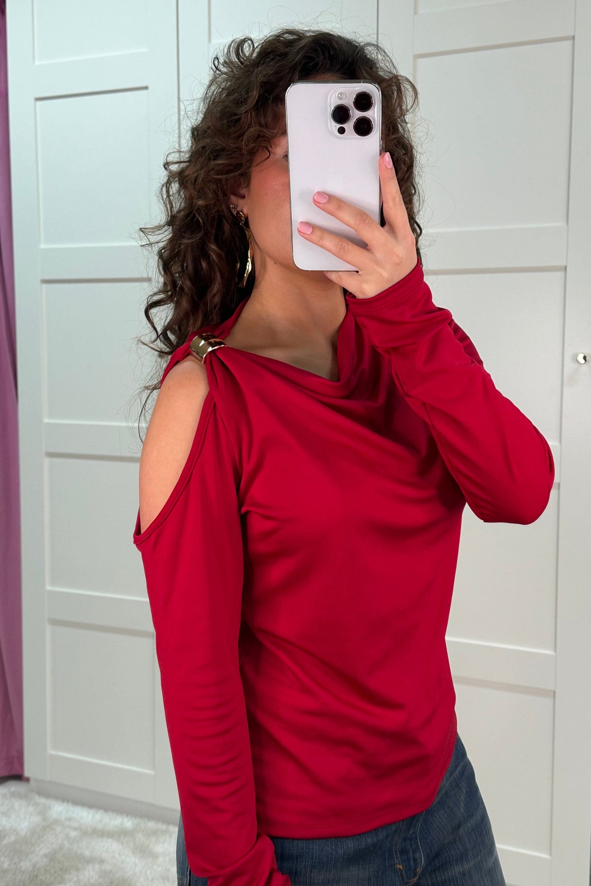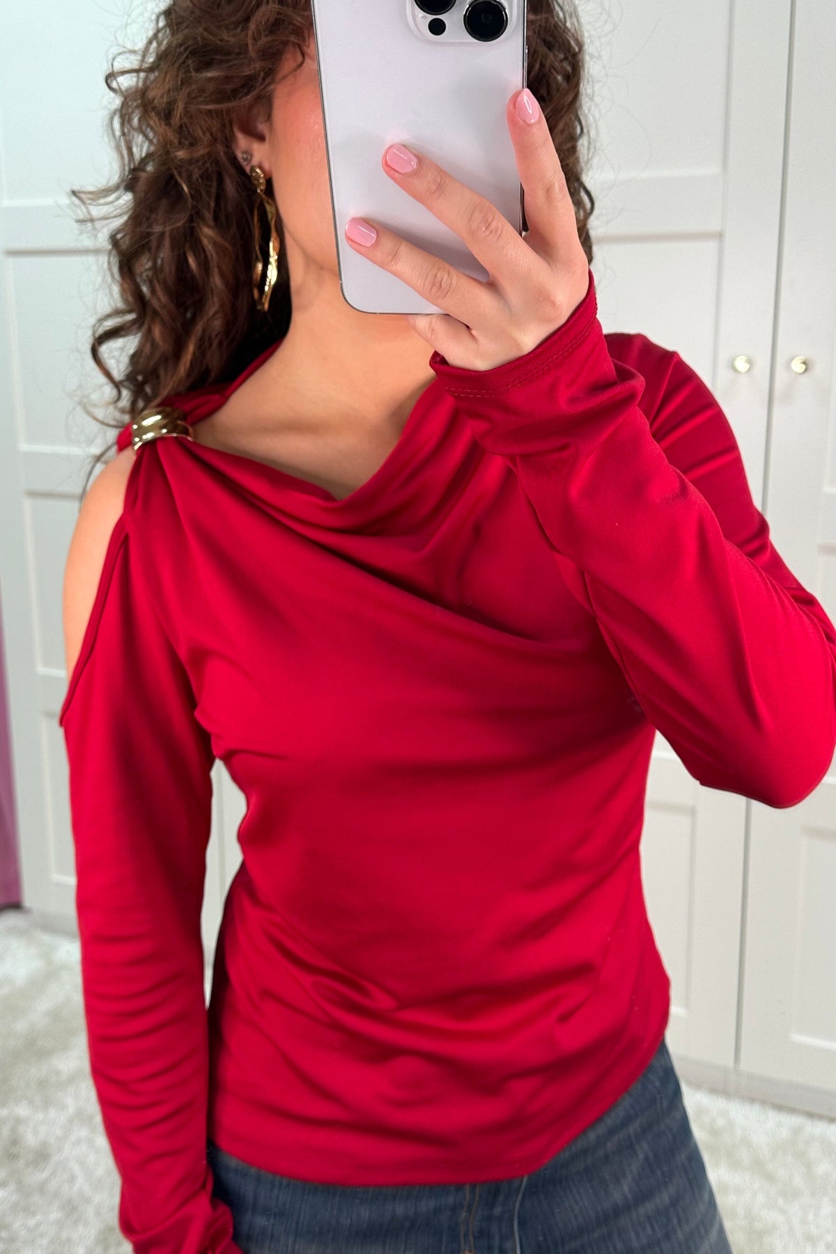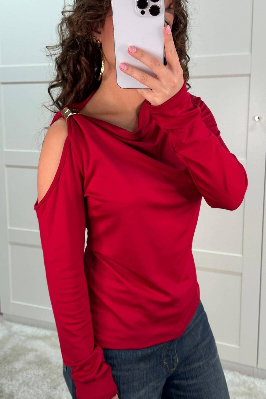 Bluzka marki A-bee w głębokim bordowym kolorze. Bluzka ma dekolt typu off-shoulder z dekoracyjną złotą klamrą na ramieniu.