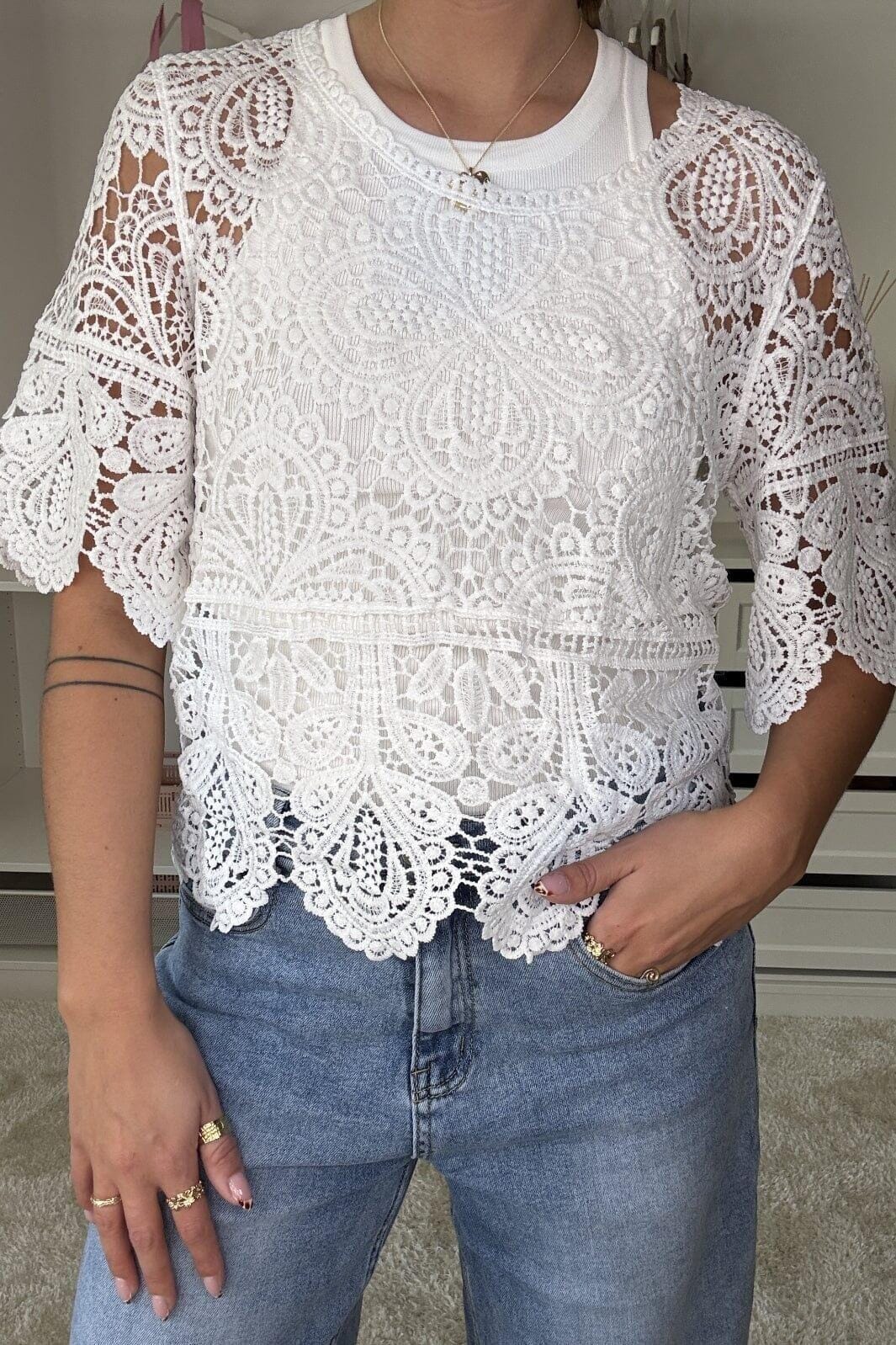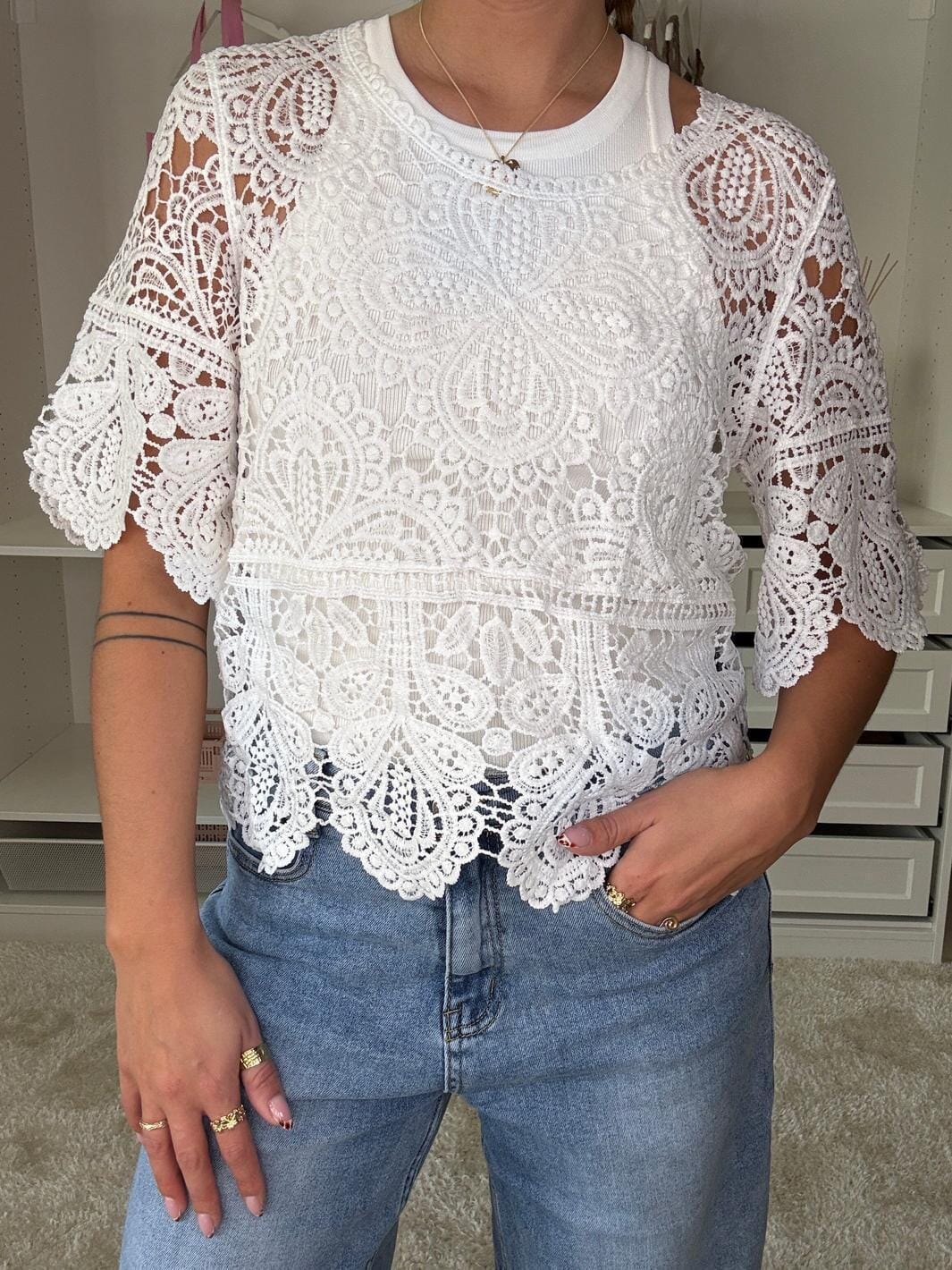 Biała koszulka od A-bee z kwiatowym wzorem na całym projekcie. Koszulka ma okrągły dekolt i rękawy 3/4 z koronkowym wykończeniem.