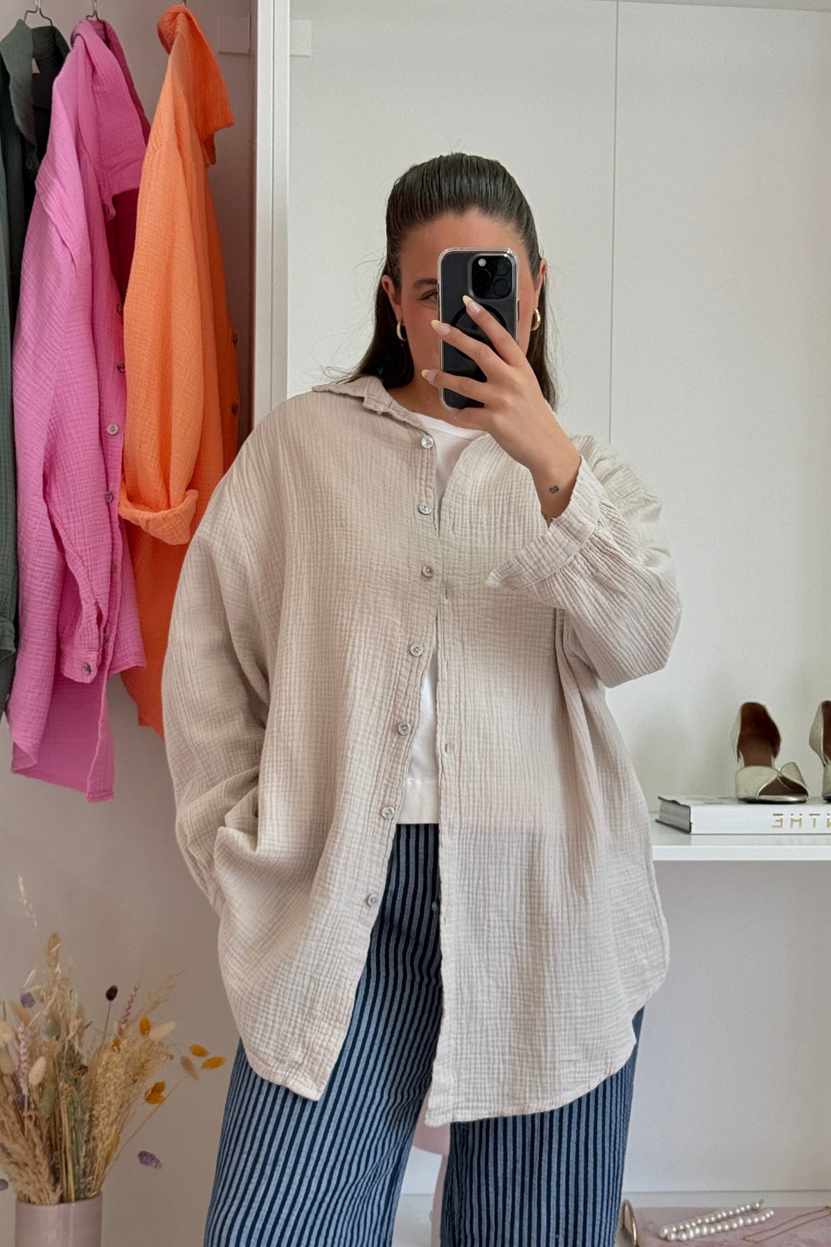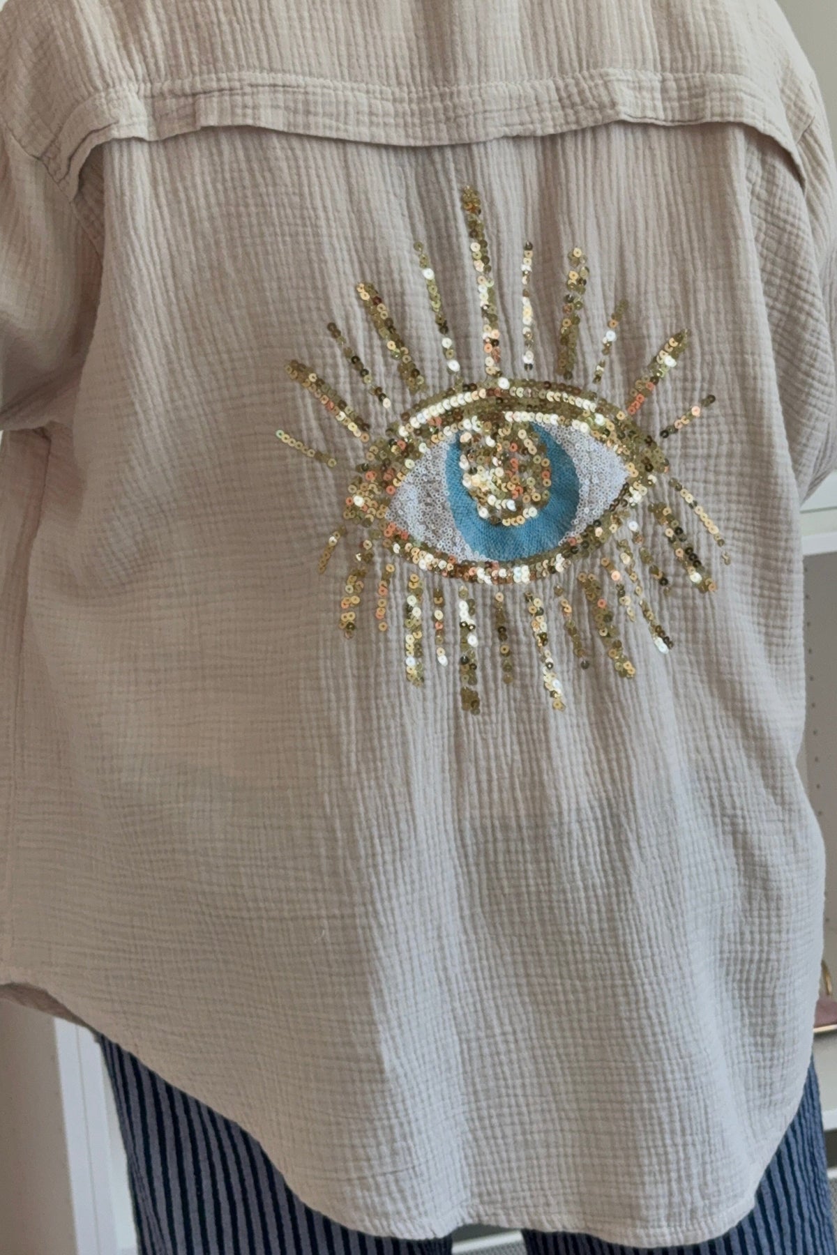 Beżowa koszula od A-bee z strukturalnej tkaniny bawełnianej. Koszula ma guziki z przodu i dekoracyjny wzór oka z cekinami na plecach.