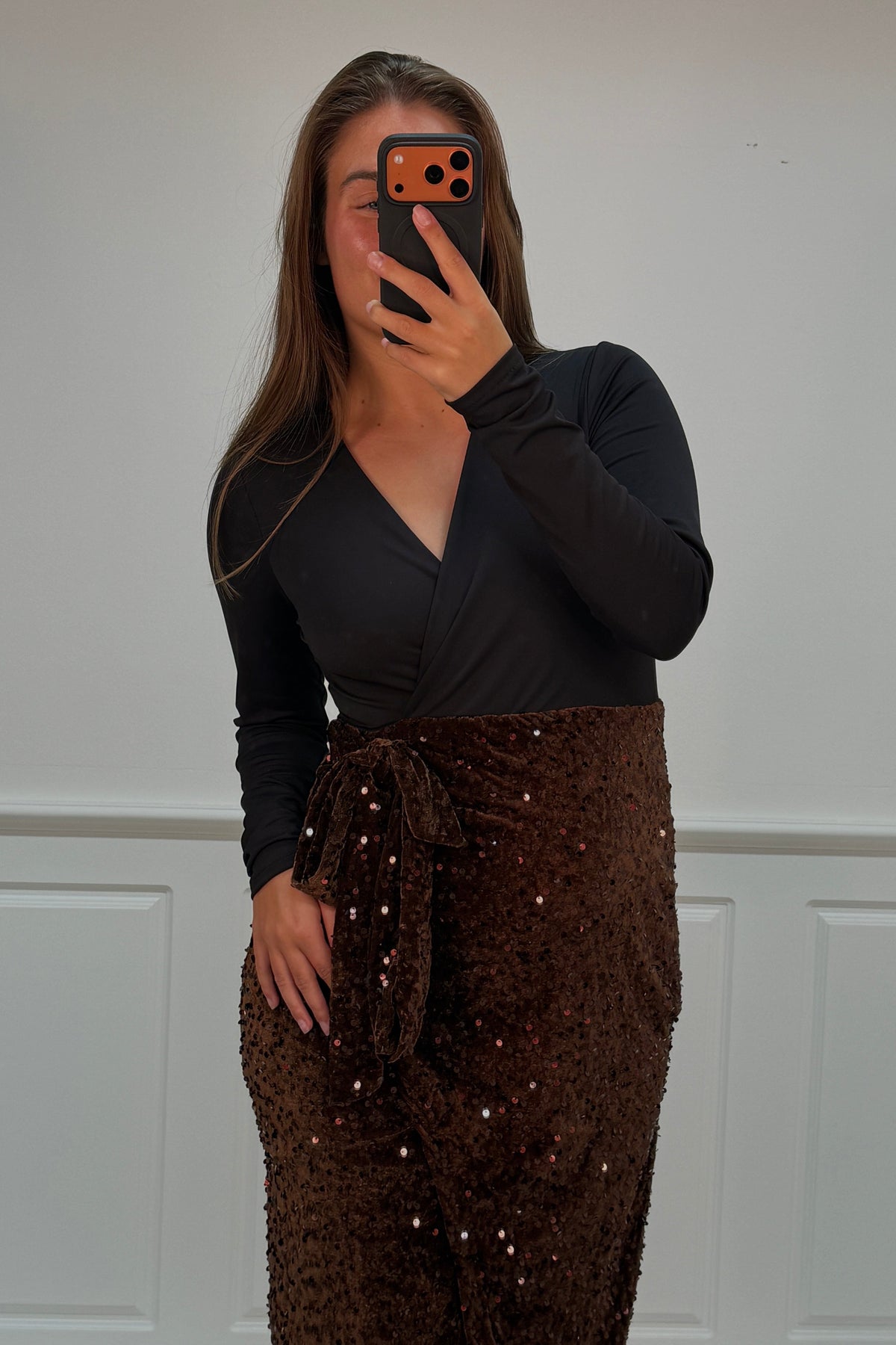 Sukienka od A-bee z czarną górą i ciemnobrązowym dołem ozdobionym cekinami. Ma styl kopertowy z dekoltem w kształcie litery V i długimi rękawami. Dół sięga do łydek.