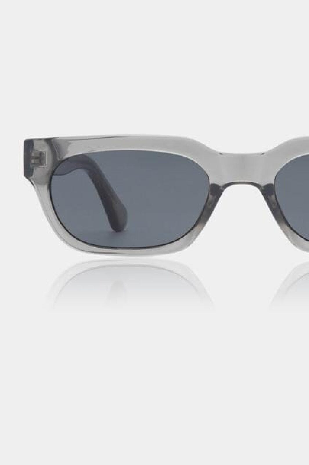 Okulary przeciwsłoneczne A. Kjærbede w szarym przezroczystym kolorze o prostokątnym kształcie. Okulary wykonane są z materiału Tritan Renew z ciemnymi soczewkami i mają przezroczystą oprawę.