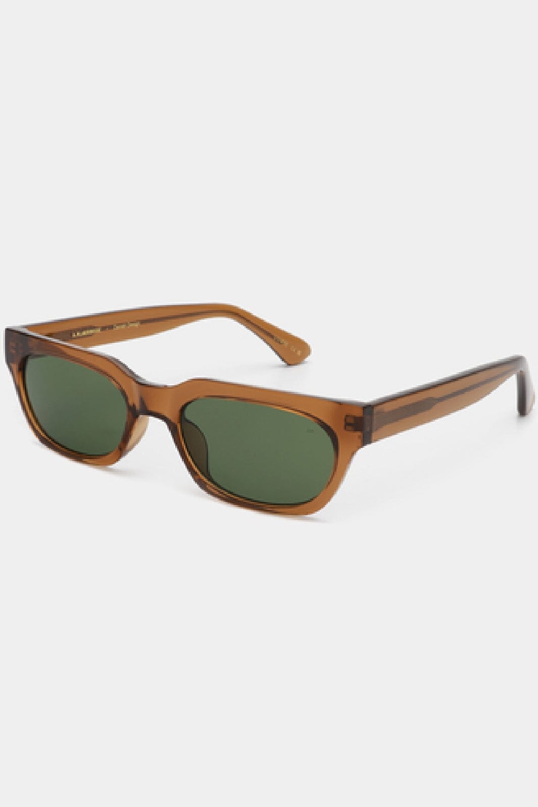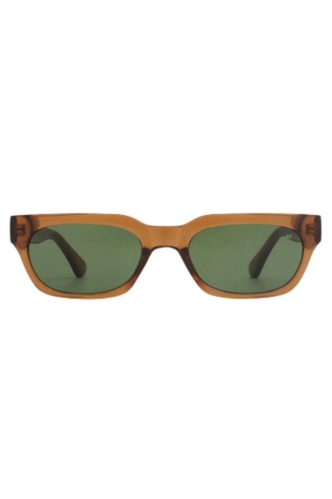 Przezroczyste okulary przeciwsłoneczne od A. Kjærbede w prostokątnym kształcie i zielonych soczewkach. Okulary mają ochronę UV400 i są wykonane z trwałego materiału Tritan Renew z formowalnymi zausznikami.