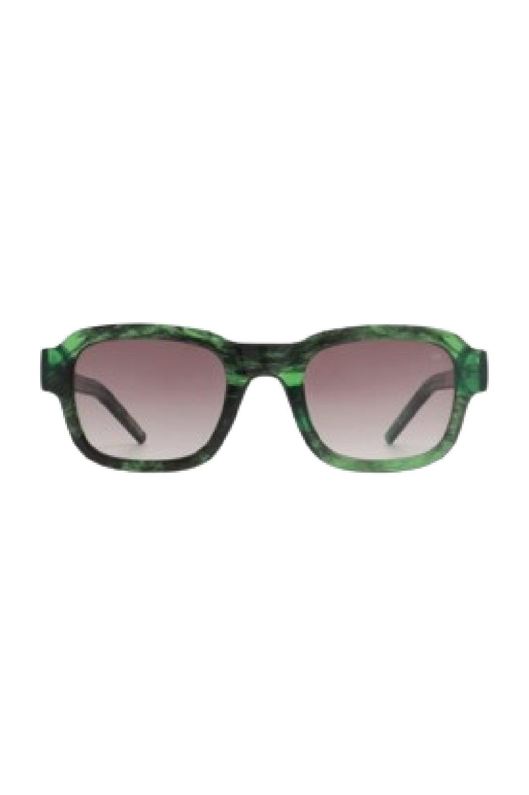 Okulary przeciwsłoneczne od A. Kjærbede z zielonym marmurkowym, przezroczystym szkieletem. Okulary mają ochronę UV400 i są wyposażone w zawiasy optycznej jakości oraz formowalne zauszniki z metalowymi rdzeniami.