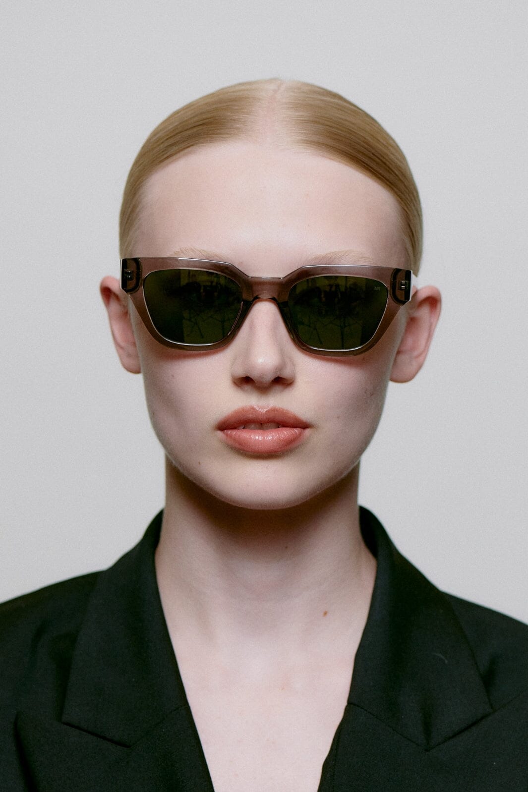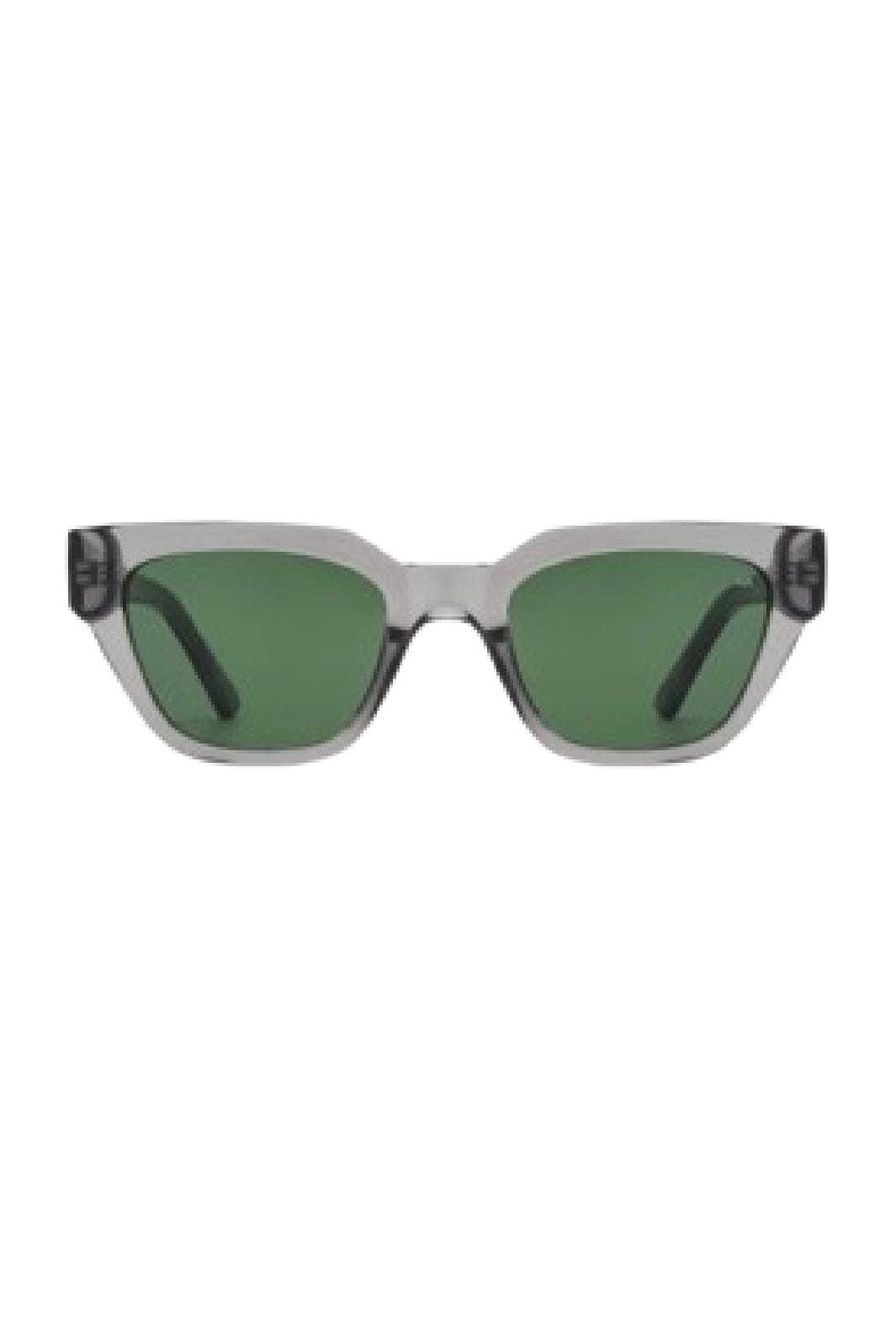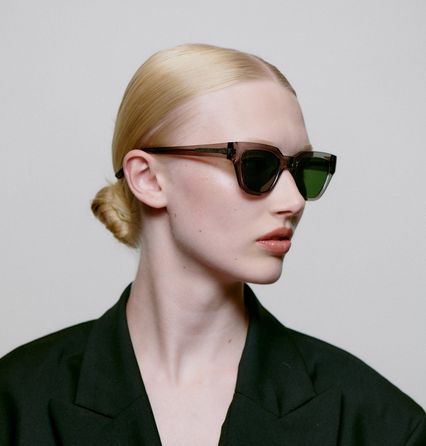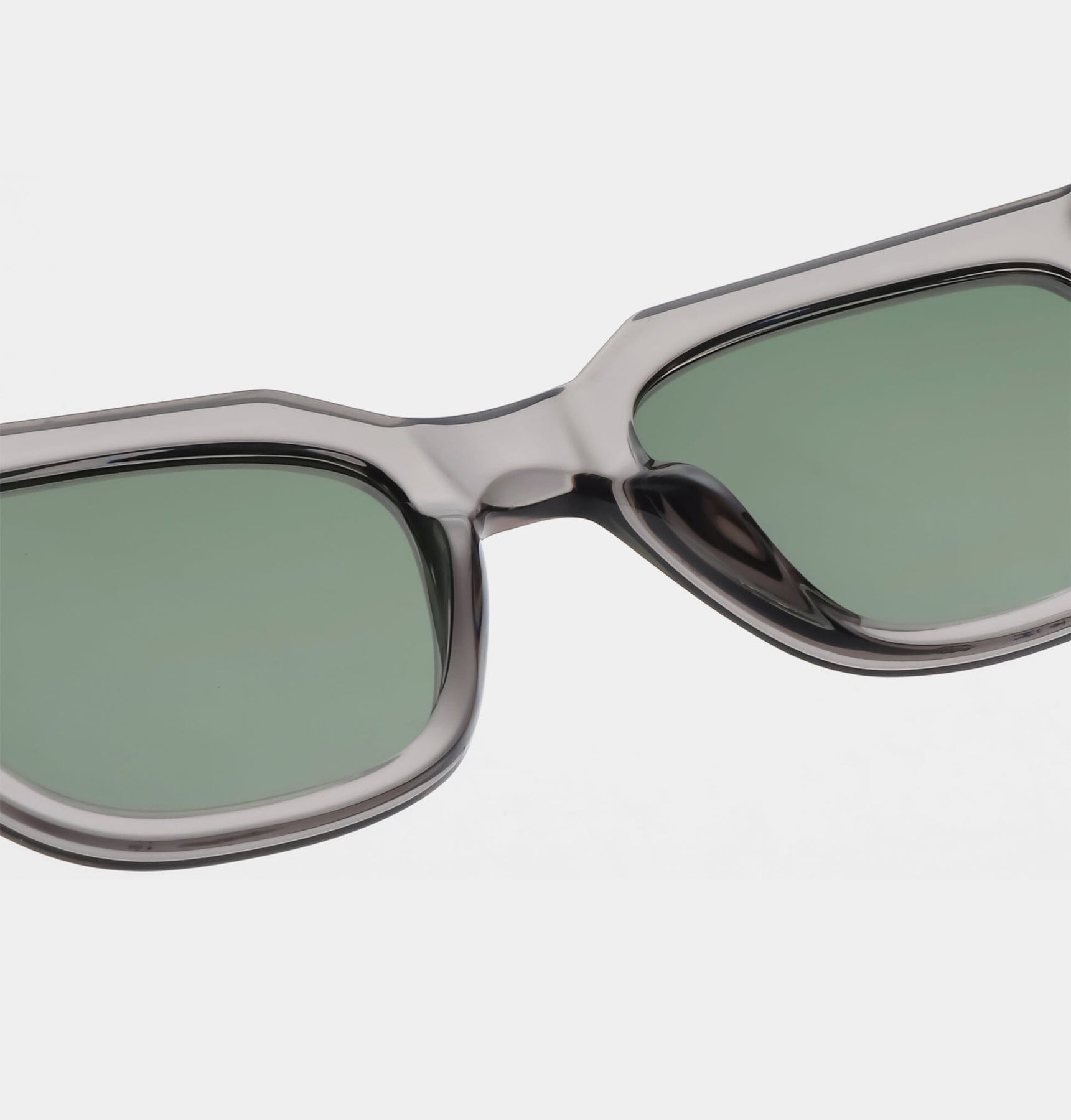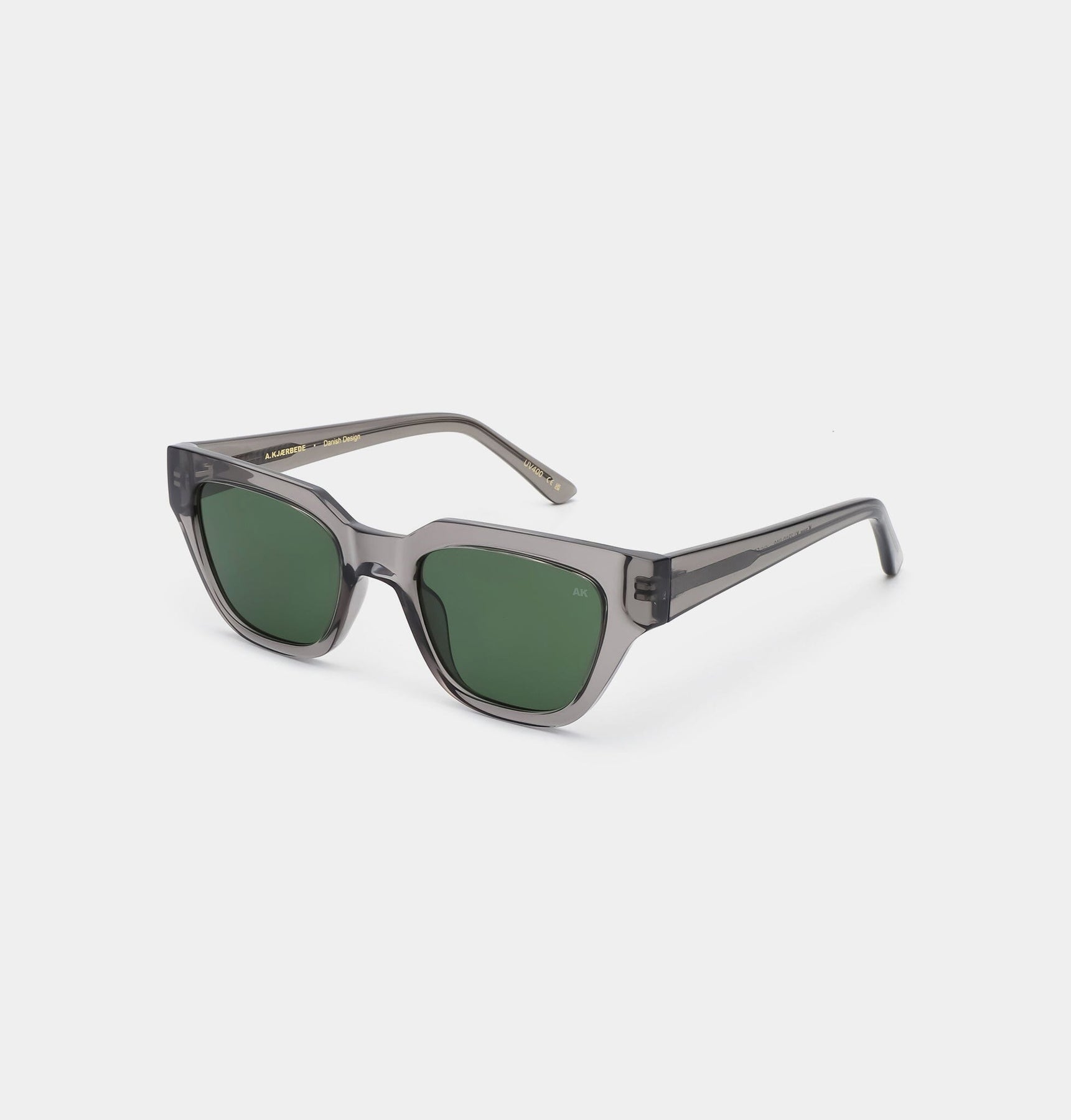 Okulary przeciwsłoneczne od A. Kjærbede z szarym przezroczystym szkieletem i zielonymi soczewkami. Kształt cat-eye ma kanciaste krawędzie, a szkło wykonane jest z poliwęglanu z wysokiej jakości zawiasami optycznymi.