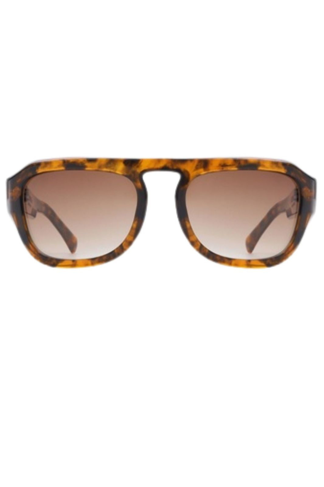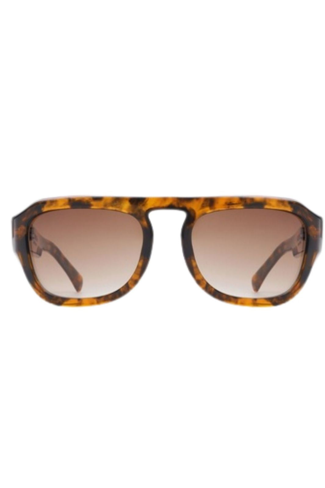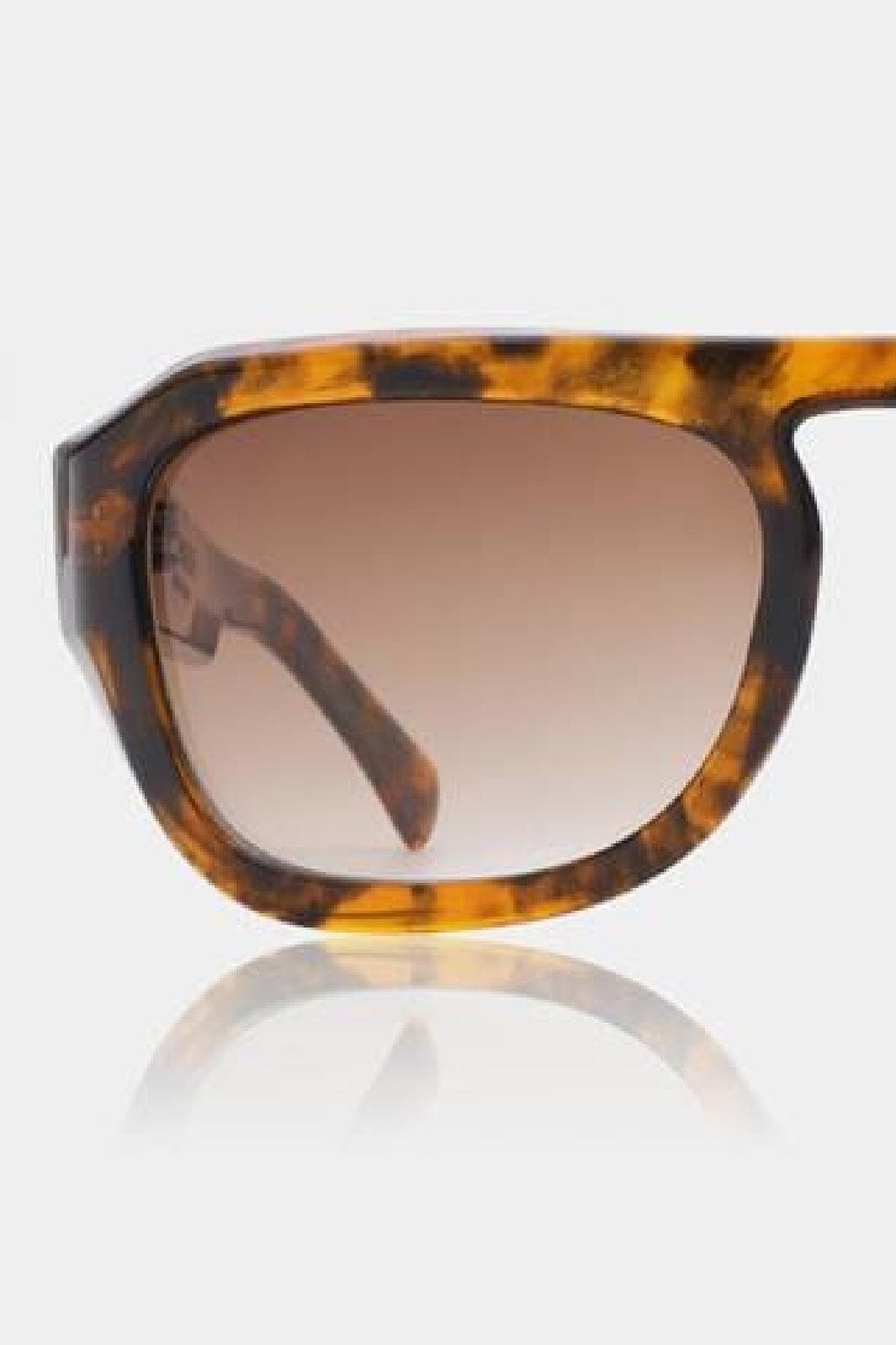 Okulary przeciwsłoneczne od A. Kjærbede z brązową oprawą w kolorze havany i gradientowymi soczewkami. Oprawa ma szeroką, inspirowaną aviatorami formę z solidnymi krawędziami i brązowymi odcieniami.