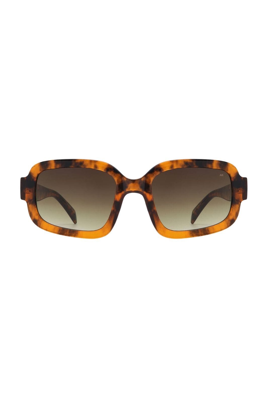 Okulary przeciwsłoneczne od A. Kjærbede z kwadratową ramką w brązowym kolorze Havana. Ramka ma wzór w żółwia i przyciemnione soczewki gradientowe z mocną ramą.