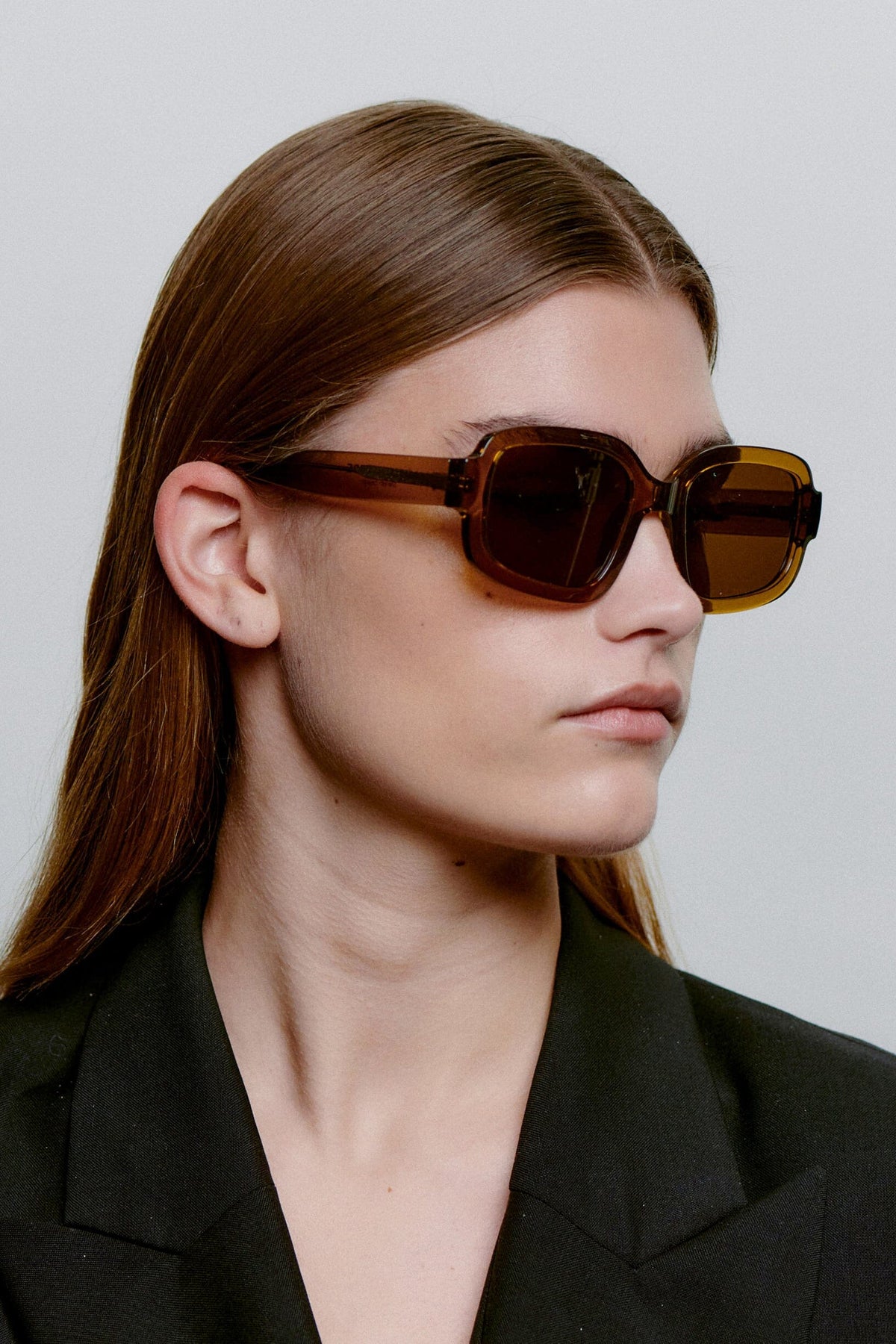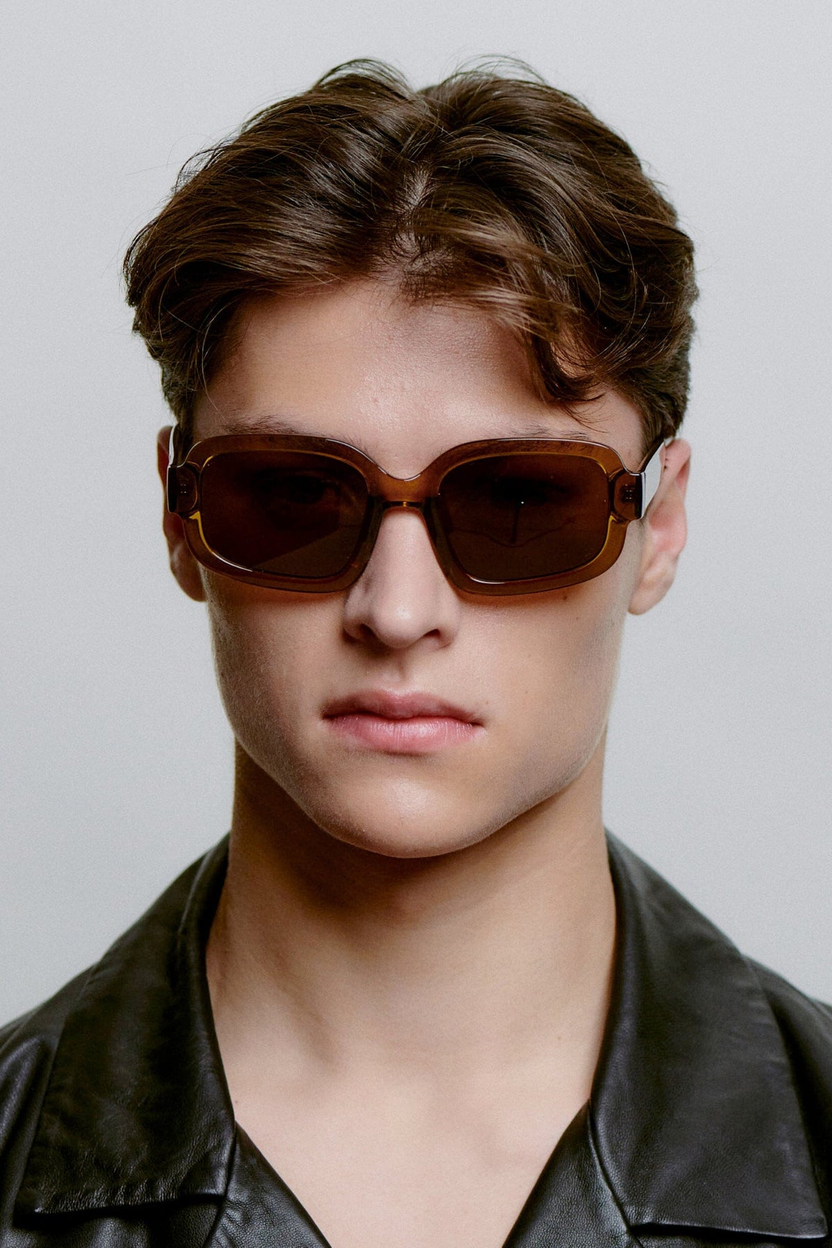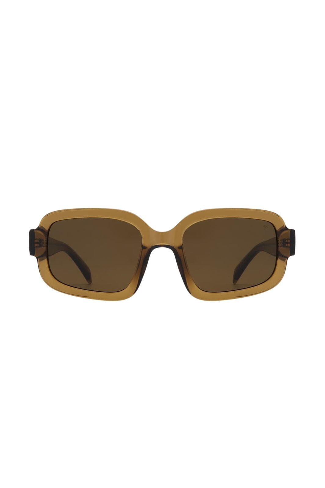 Oversized okulary przeciwsłoneczne od A. Kjærbede z mocnym ramieniem w przezroczystym brązie. Okulary mają prostokątny kształt z miękkimi krzywiznami i przyciemnionymi szkłami, które zapewniają dobrą ochronę przed słońcem.
