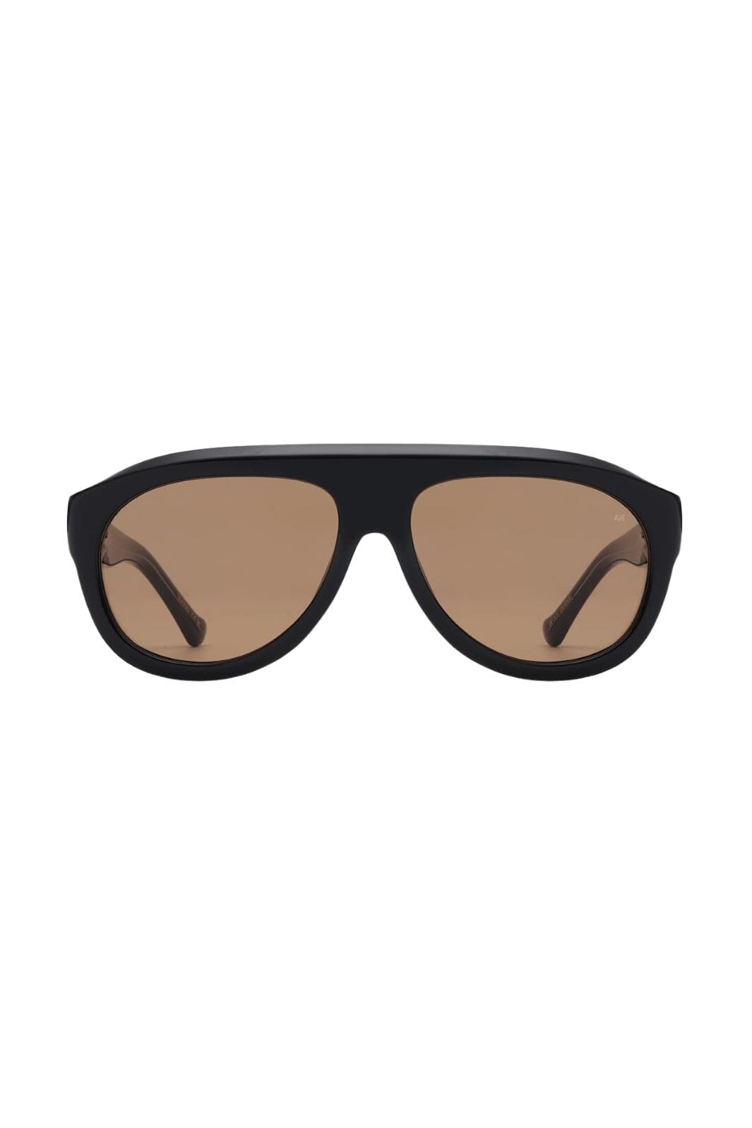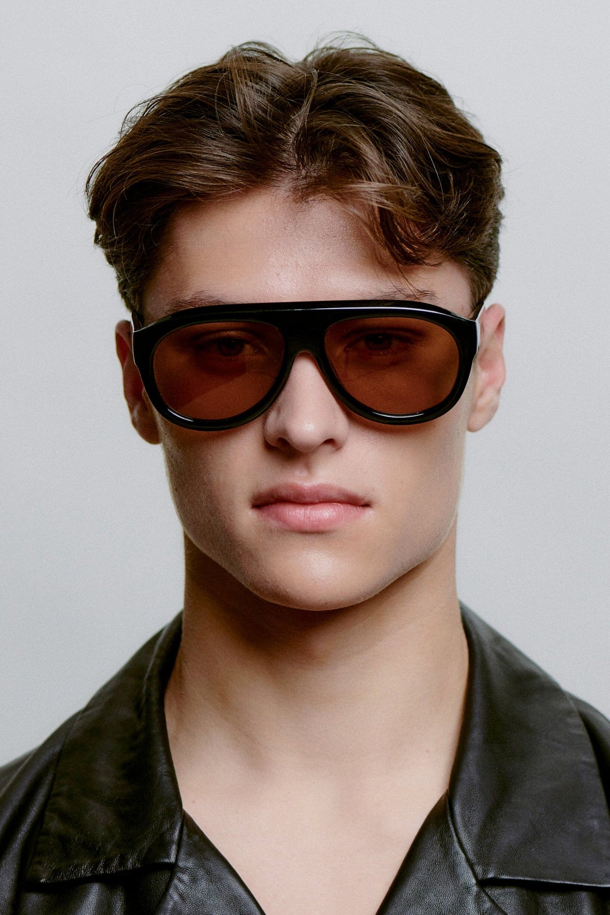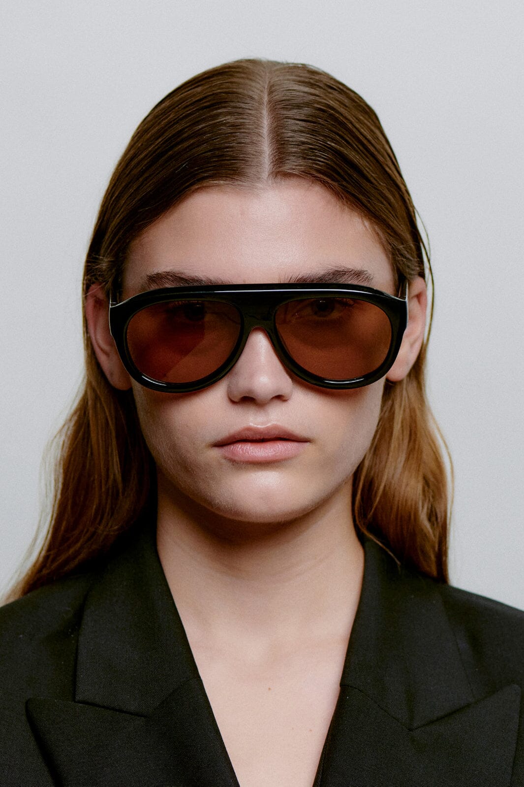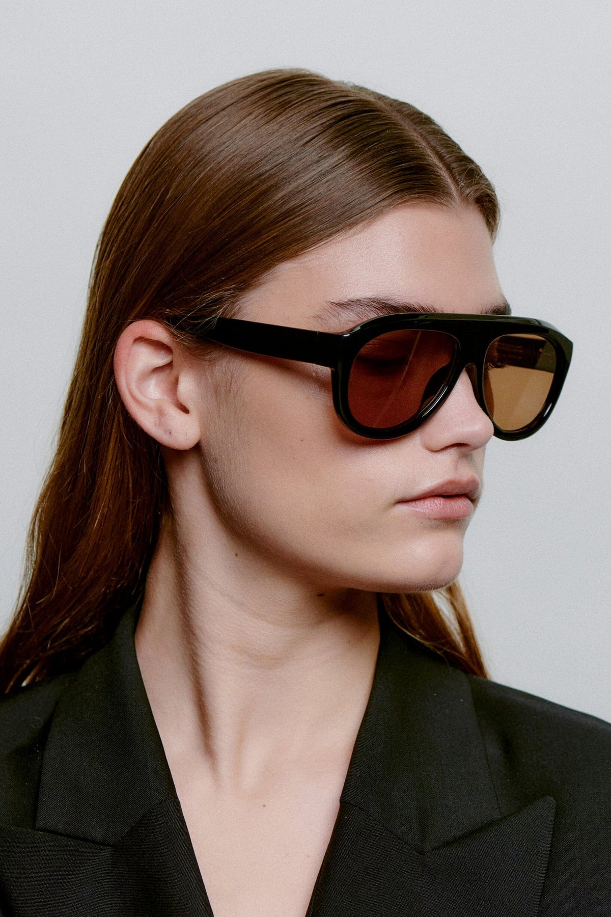 Czarne okulary przeciwsłoneczne od A. Kjærbede z ramką inspirowaną aviatorami. Okulary mają szeroką, rzeźbioną formę z brązowymi soczewkami i wyraźnym mostkiem o szerokości 16 mm.
