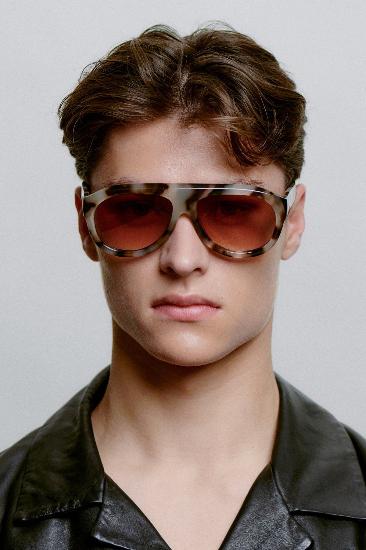 Okulary przeciwsłoneczne od A. Kjærbede z wzorzystym szkieletem w brązowych i szarych odcieniach. Szkielet ma kształt aviatora z gradientowymi soczewkami i charakterystycznym wzorem w kolorze Cookie Dough.