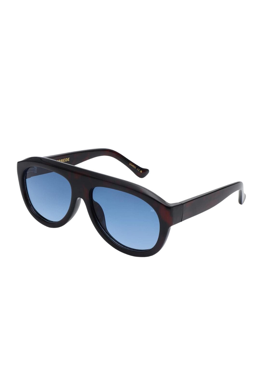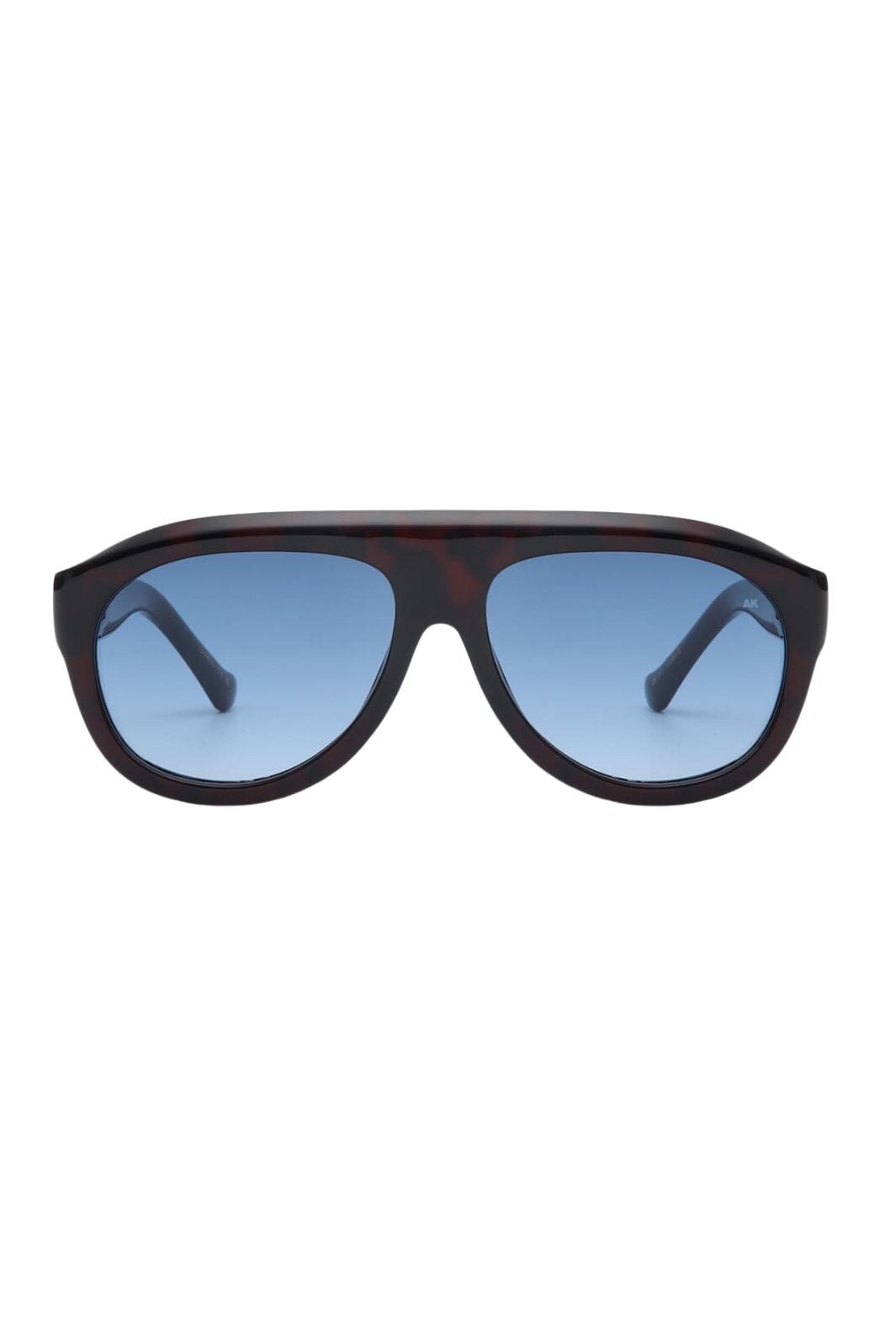 Okulary przeciwsłoneczne od A. Kjærbede w designie aviatora z brązową ramą demi tortoise i niebieskimi soczewkami. Rama ma dużą, rzeźbiarską formę z wyraźnymi liniami.