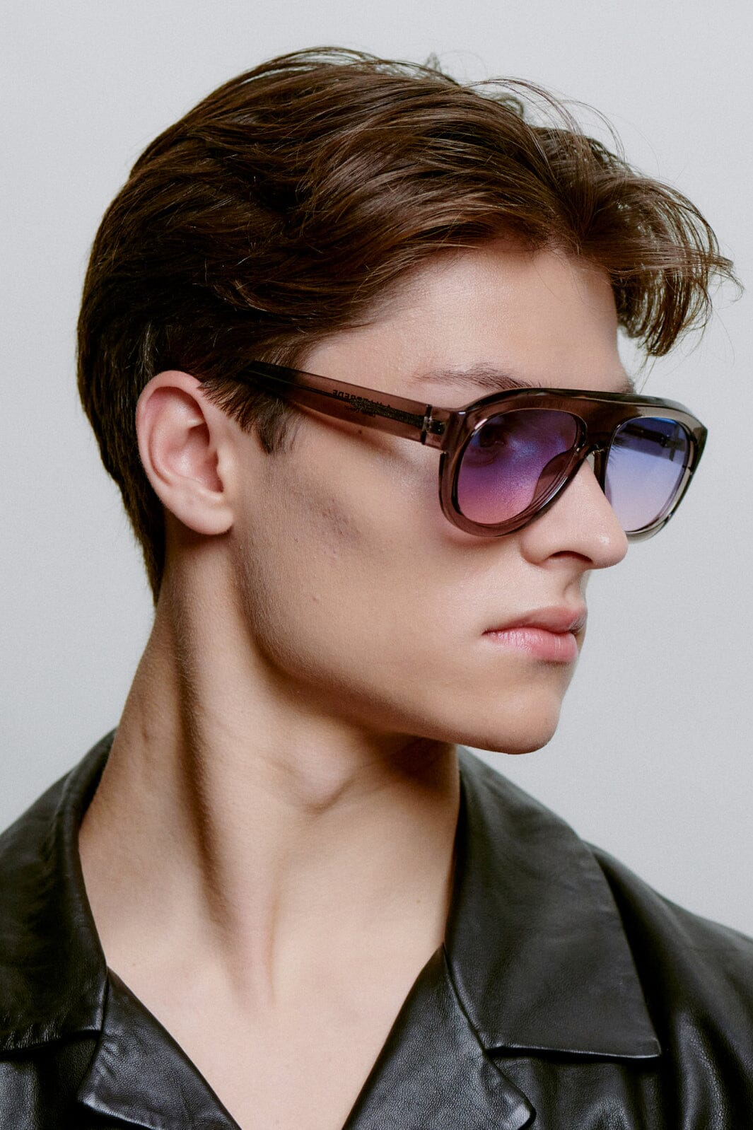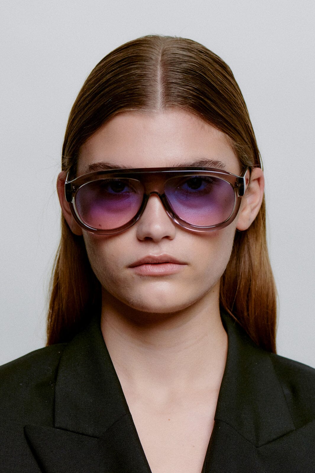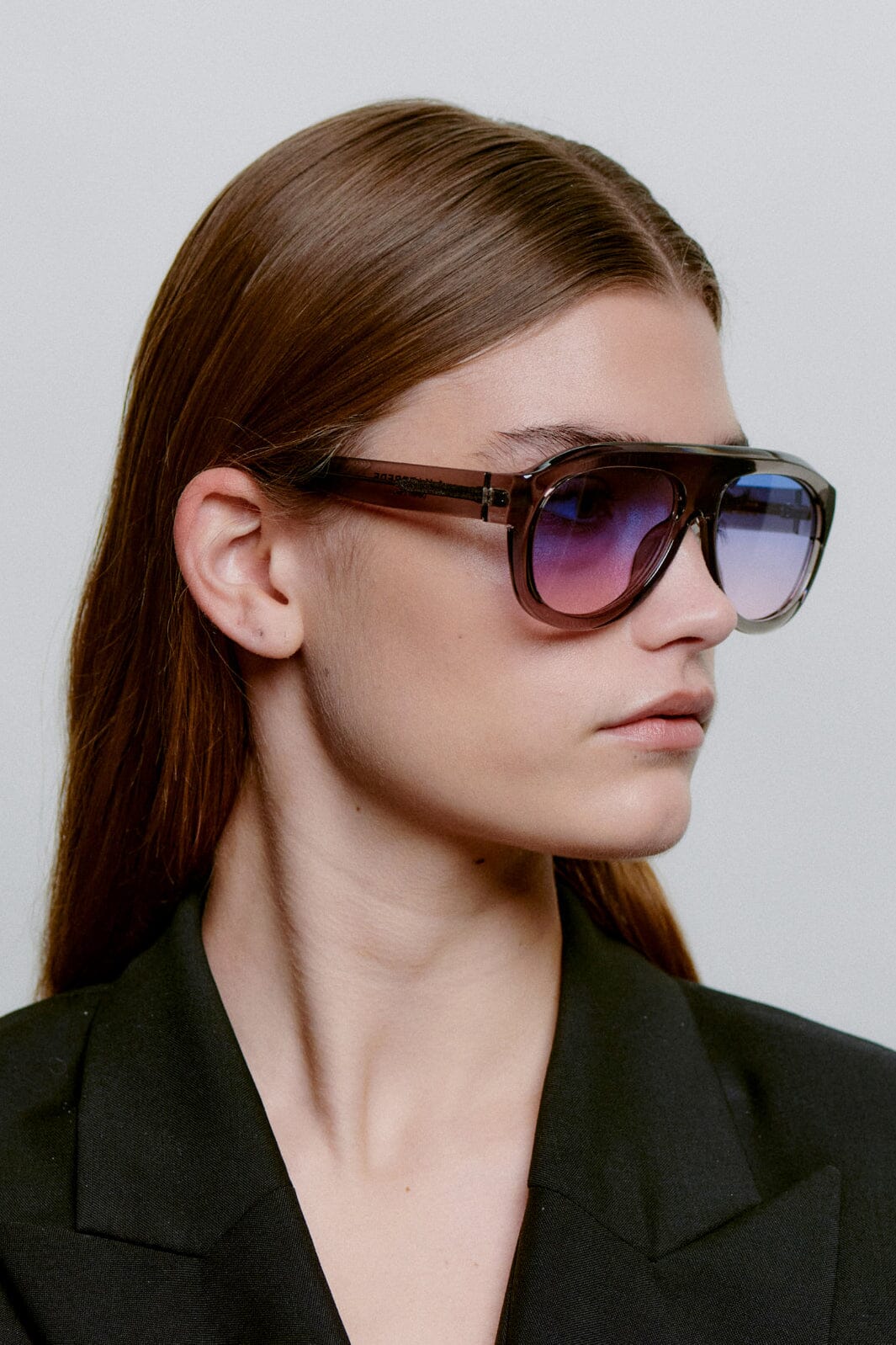 Okulary przeciwsłoneczne od A. Kjærbede z szarym, przezroczystym szkieletem i gradientowymi soczewkami od niebieskiego do jasnych odcieni. Oversize'owy model aviator z szerokim mostkiem o szerokości 16 mm.