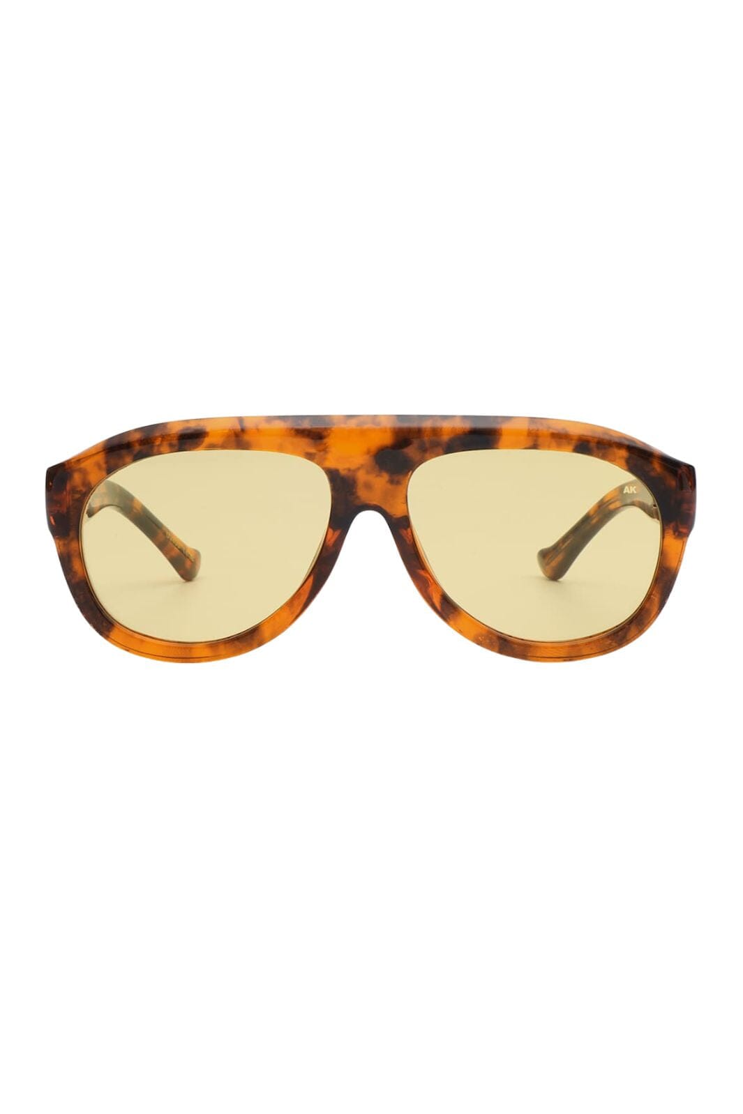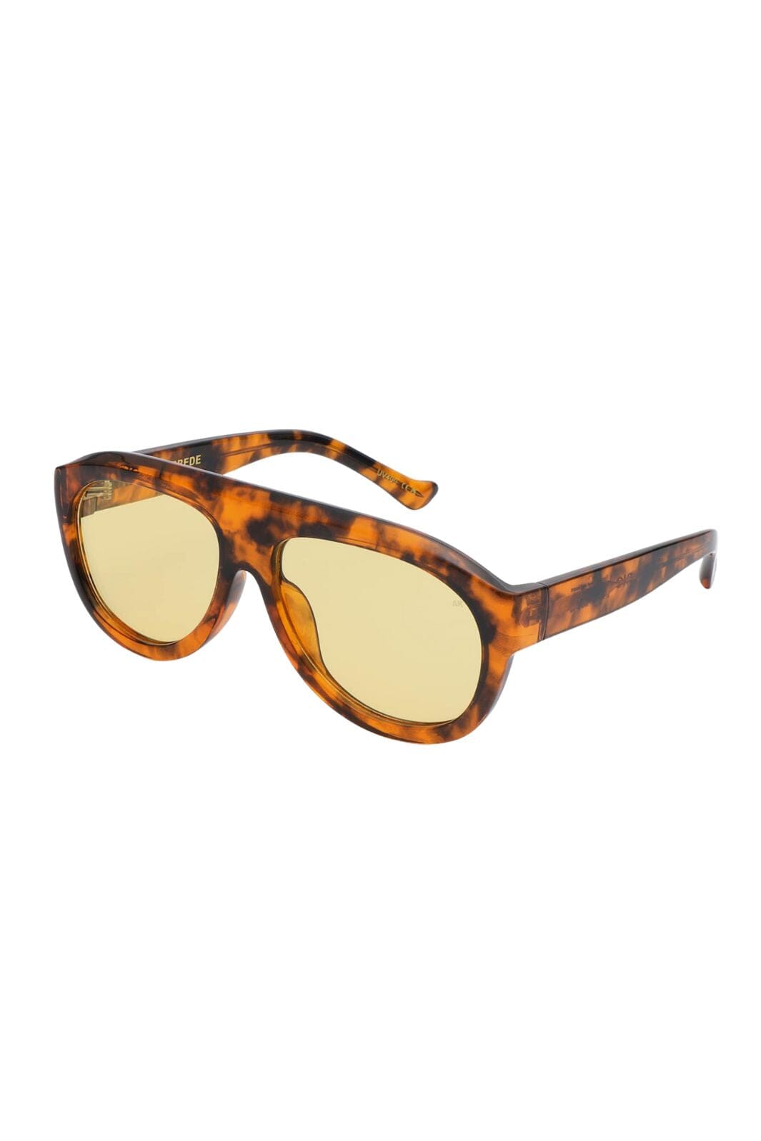 Okulary przeciwsłoneczne od A. Kjærbede w pomarańczowo-brązowo-żółtej kombinacji kolorów. Oprawa ma szeroką górną krawędź i charakterystyczny wzór w żółwia z żółtymi soczewkami.