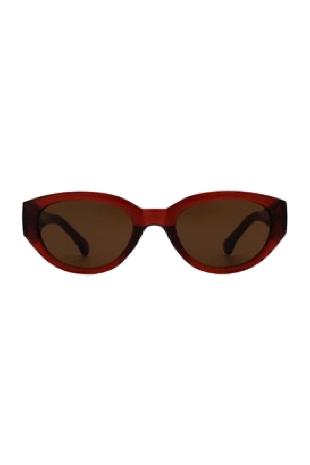 Brązowe okulary przeciwsłoneczne od A. Kjærbede w kocim kształcie. Okulary wykonane są z poliwęglanu z błyszczącą powierzchnią i mają formowalne zauszniki z metalowymi rdzeniami.