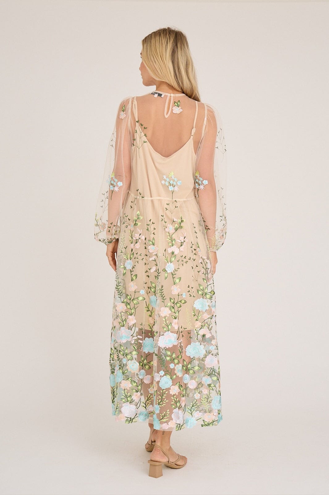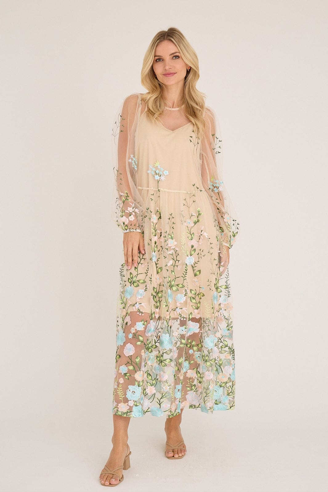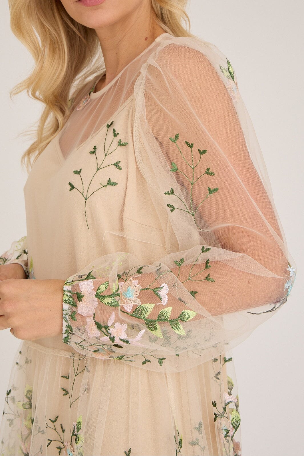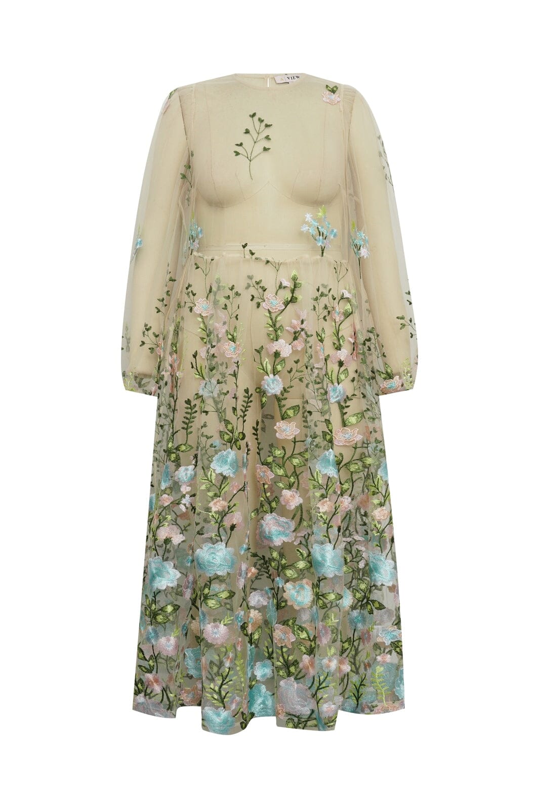 Sukienka marki A-View z transparentnej siateczki z haftowanymi kwiatami w odcieniach różu i niebieskiego. Sukienka ma luźny krój i sięga do kostek.