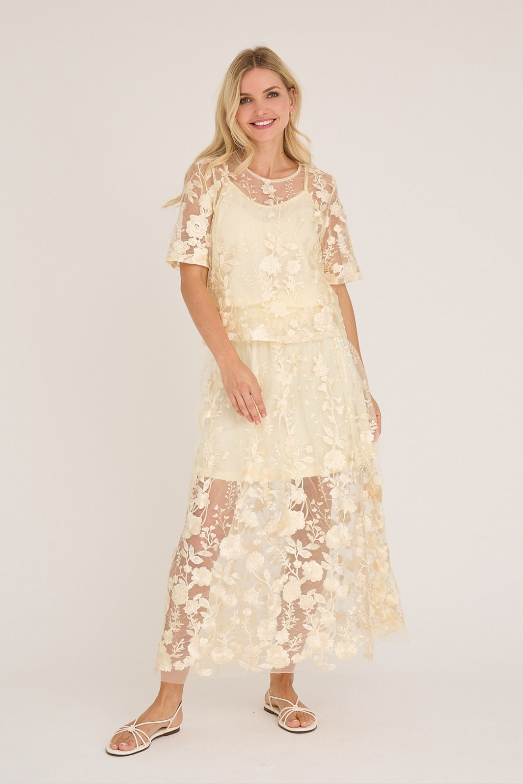 Długa spódnica A-View w jasnym żółtym kolorze. Spódnica wykonana jest z transparentnej siateczki z kwiatowym haftem na całym materiale.
