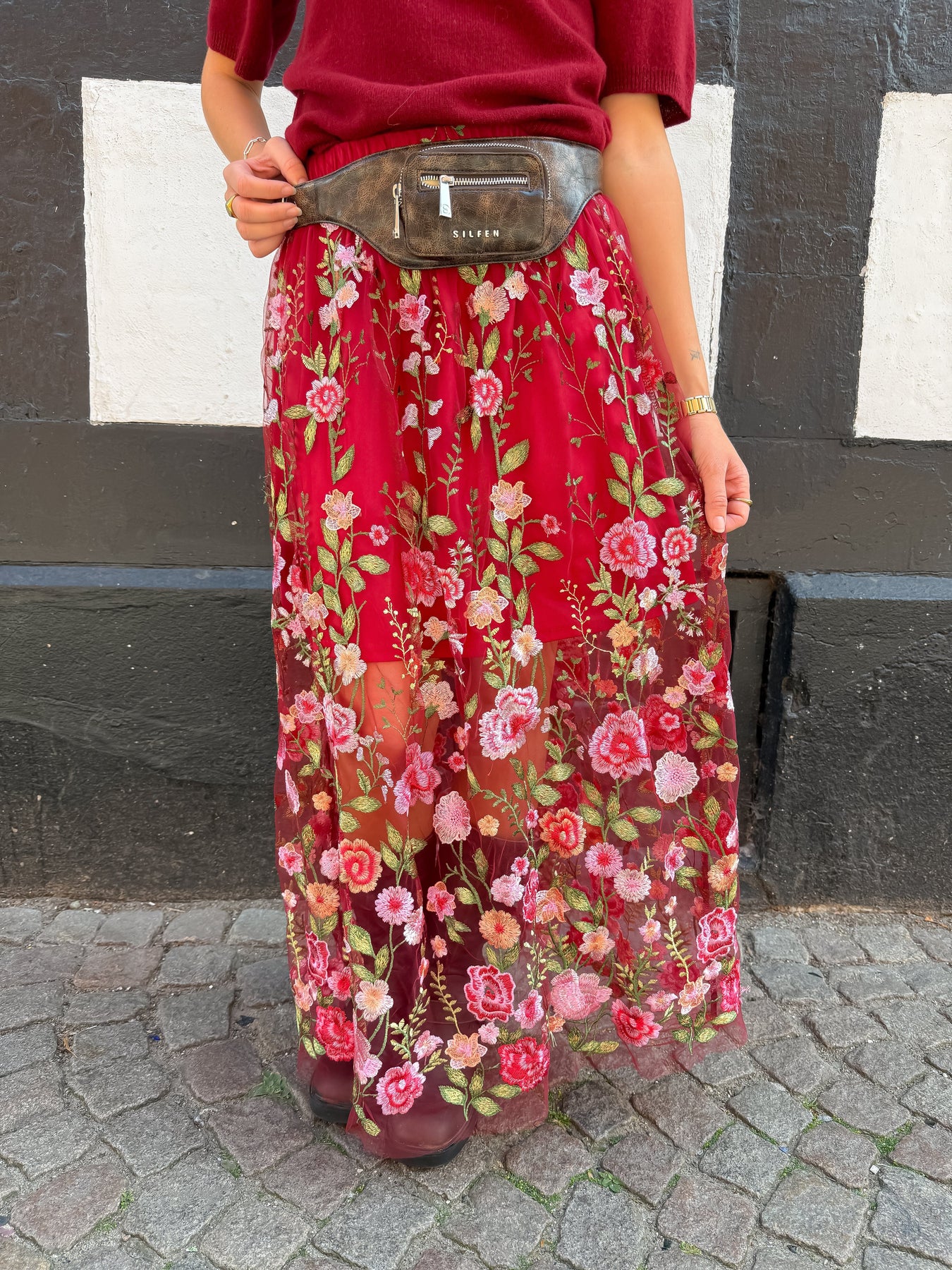Długa spódnica od A-View w odcieniach bordeaux i różu. Spódnica ma przezroczystą warstwę z haftowanymi kwiatami i jest dostarczana z krótką halką w kolorze bordeaux.