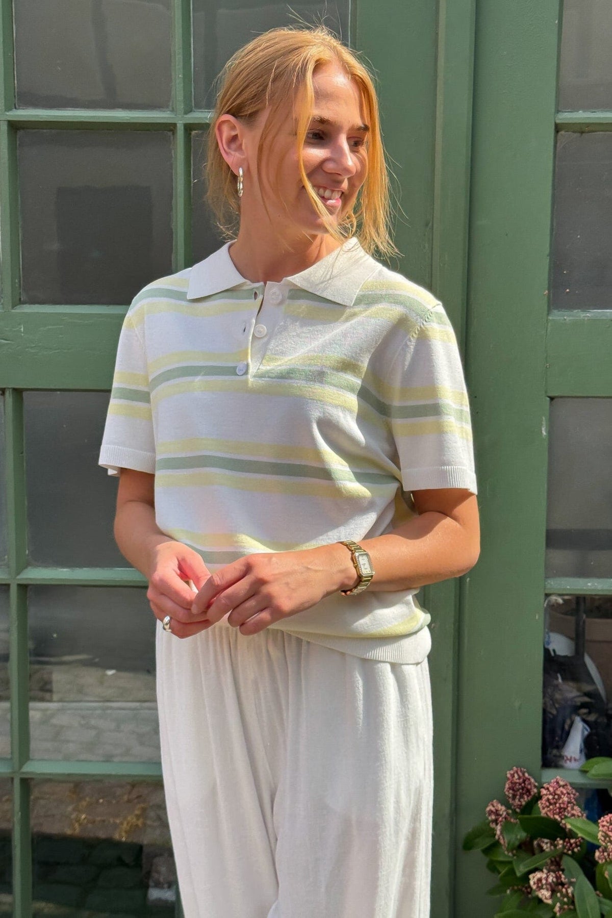 Sweter polo od A-View z poziomymi paskami w białym, żółtym i zielonym kolorze. Sweter ma klasyczny kołnierzyk polo z zapięciem na guziki i krótkie rękawy w luźnym kroju.