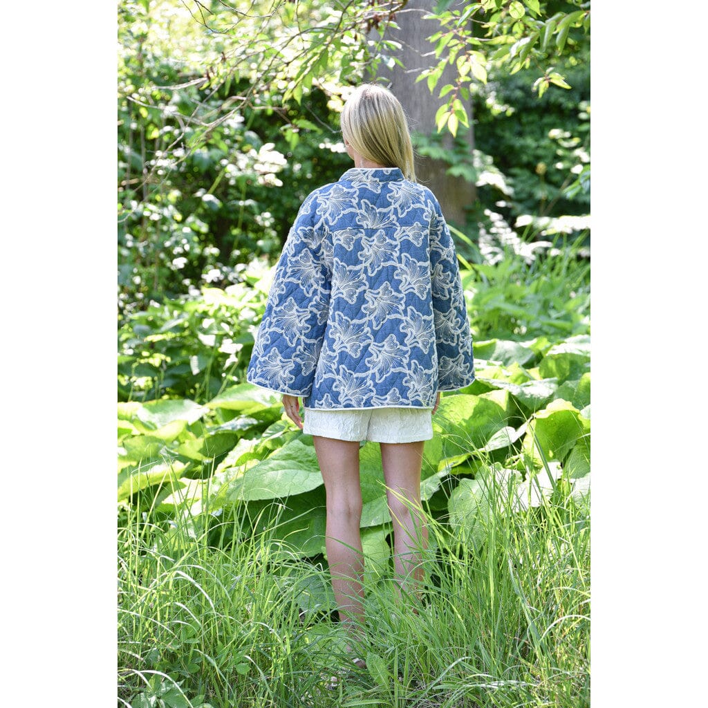 Niebieska kurtka A-View z haftem kwiatowym w kolorze złamanej bieli. Kurtka ma dekoracyjne przeszycia i wiązania, które nadają jej rękodzielniczy charakter.
