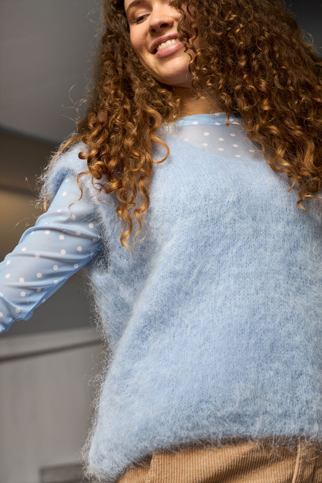 Jasnoniebieski bezrękawnik typu pullover od Black Colour. Kamizelka wykonana jest z mieszanki moheru i poliamidu o miękkiej, puszystej fakturze.