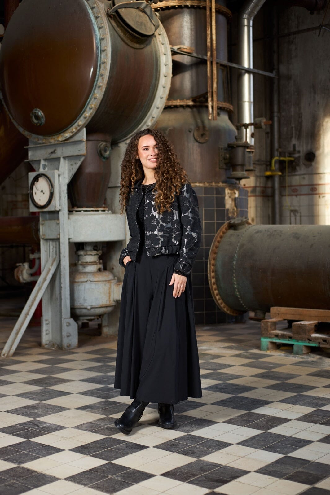 Czarna spódnica od Black Colour o pięknym spadzie. Luźny krój i długość do kolan zapewniają dużą swobodę ruchów. Guziki i zamek błyskawiczny zapewniają dobre zapięcie, a szlufki na pasek dają możliwość osobistego stylu.