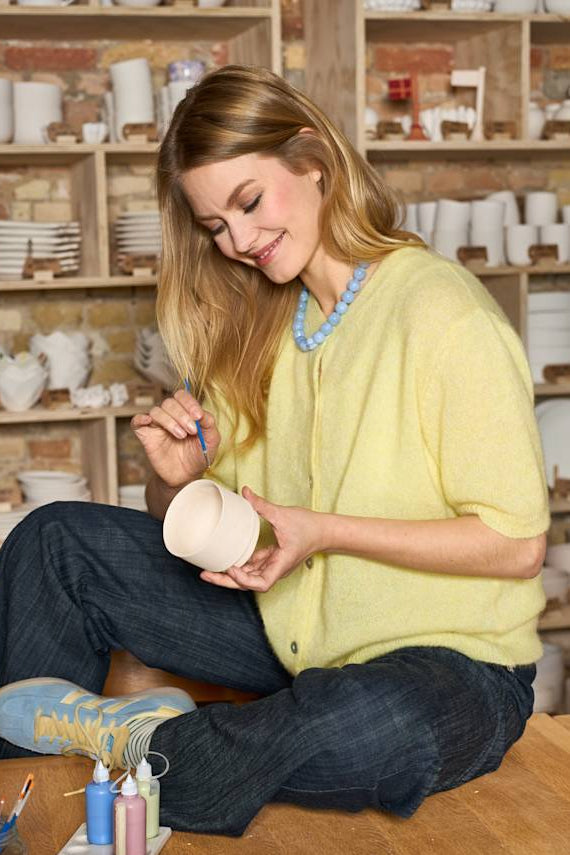 Jasnożółty kardigan marki Black Colour z okrągłym dekoltem i zapięciem na guziki z przodu. Kardigan ma krótkie rękawy i dobrze sprawdza się w swobodnych stylizacjach.
