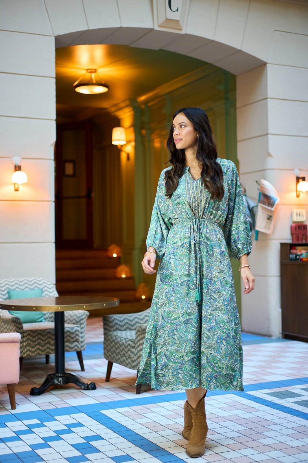 Sukienka marki Black Colour w zielonym odcieniu z wzorem paisley w niebieskich i zielonych tonach. Sukienka wykonana jest w 100% z poliestru.