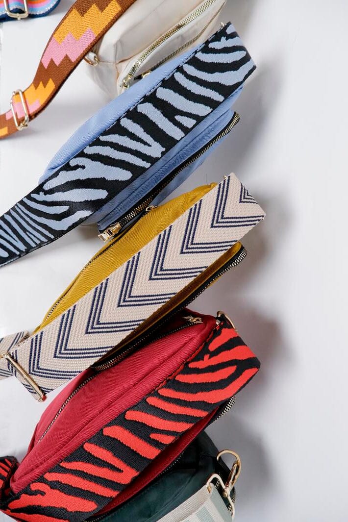 Uchwyt do torebki od Black Colour z wzorem chevron w beżowych i ciemnoniebieskich odcieniach. Wyposażony jest w złotą okucię i ma praktyczny design z regulowaną długością.