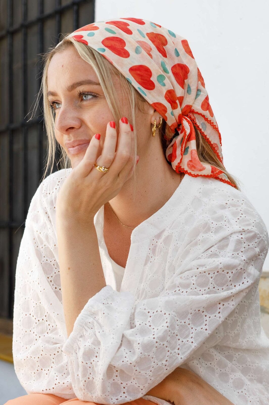 Mini szalik od Black Colour z białej bawełny z czerwonymi sercami i niebieskimi liśćmi. Dekoracyjny brzeg nadaje szalikowi ładne wykończenie.