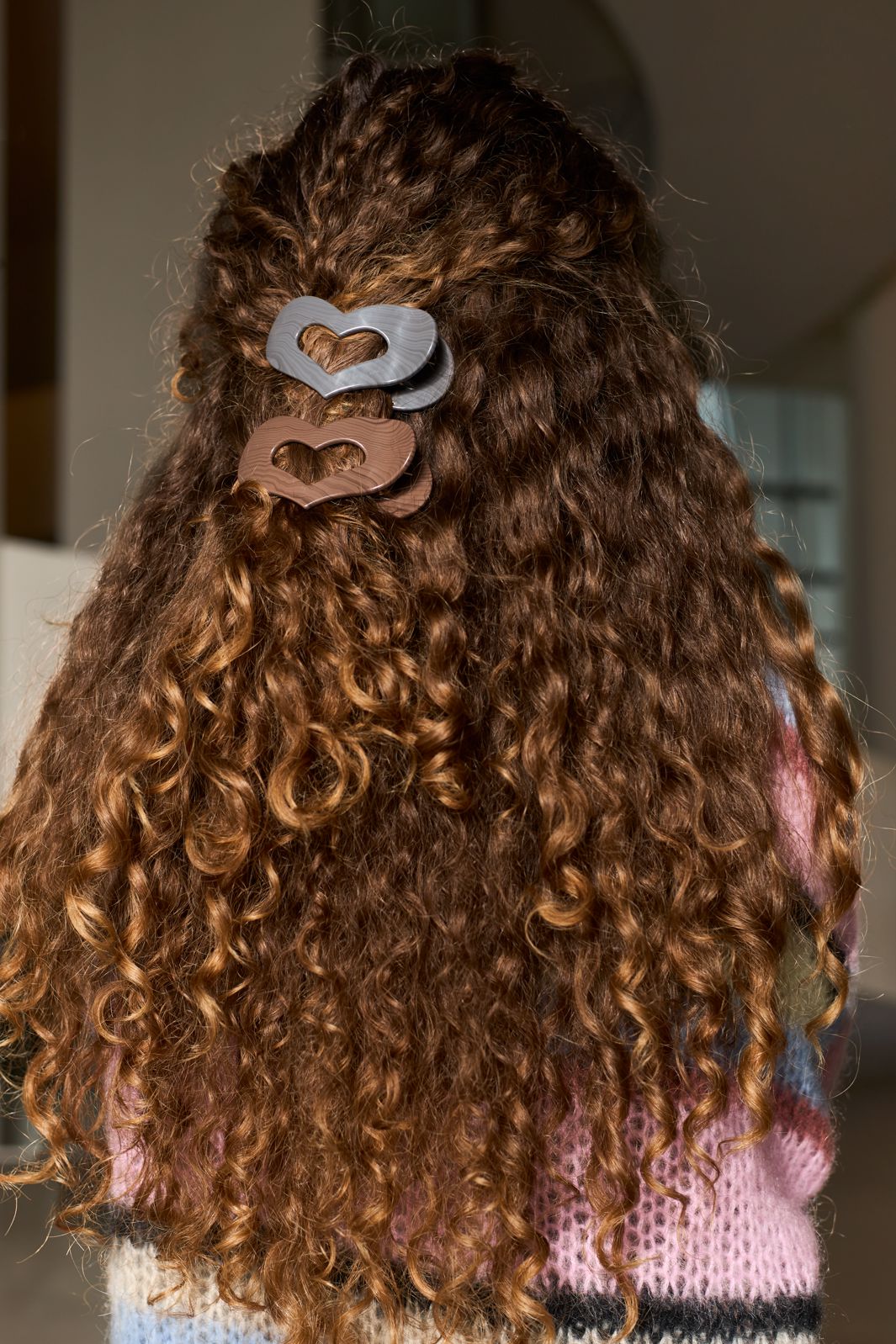 Spinka do włosów od Black Colour w szarym kolorze, o sercowatym kształcie i gładkiej, błyszczącej powierzchni. Spinka ma centralne otwarcie w kształcie serca.