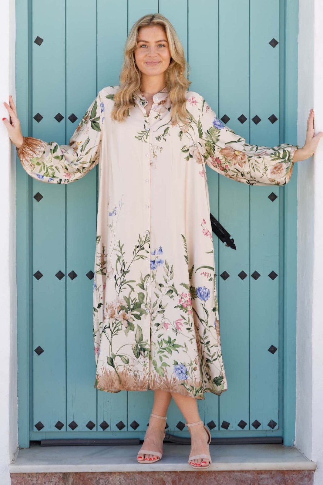 Kwiatowa sukienka od Black Colour w szampańskiej wiskozie. Sukienka ma kołnierzyk i rękawy 3/4 z wielokolorowym kwiatowym nadrukiem na całej sukience.