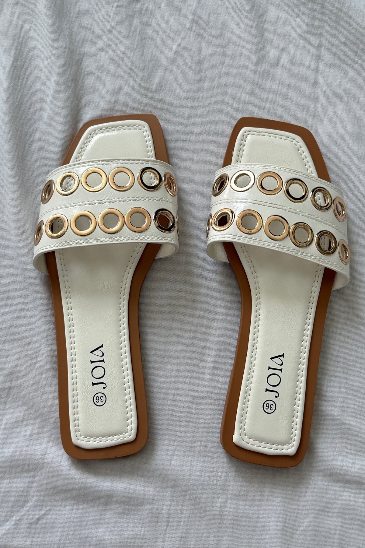 Biała sandał od Bloom z okrągłymi metalowymi detalami na pasku. Sandał ma płaską podeszwę i otwarty palec, co daje lekkie i przewiewne odczucie.