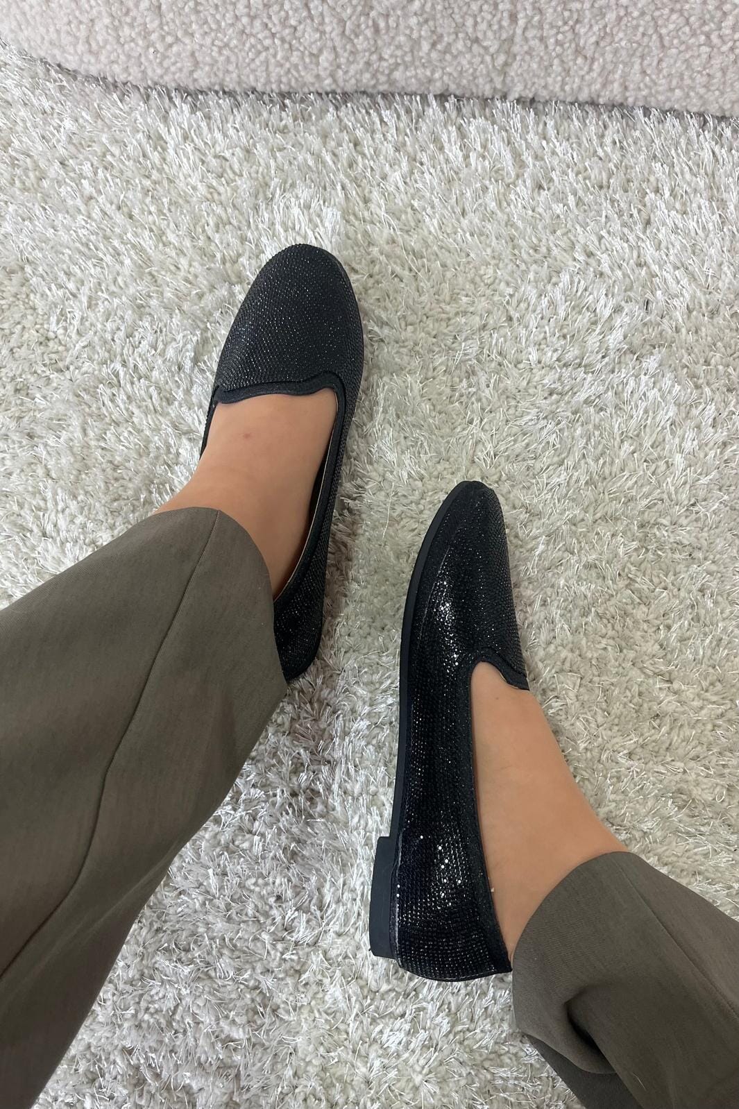 Czarne baleriny od Bloom z błyszczącymi detalami i okrągłym noskiem. Buty mają praktyczny design slip-on bez zapięć i niski obcas, co sprawia, że są łatwe do noszenia na co dzień.