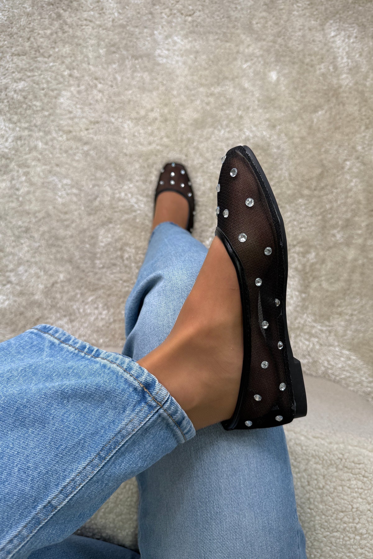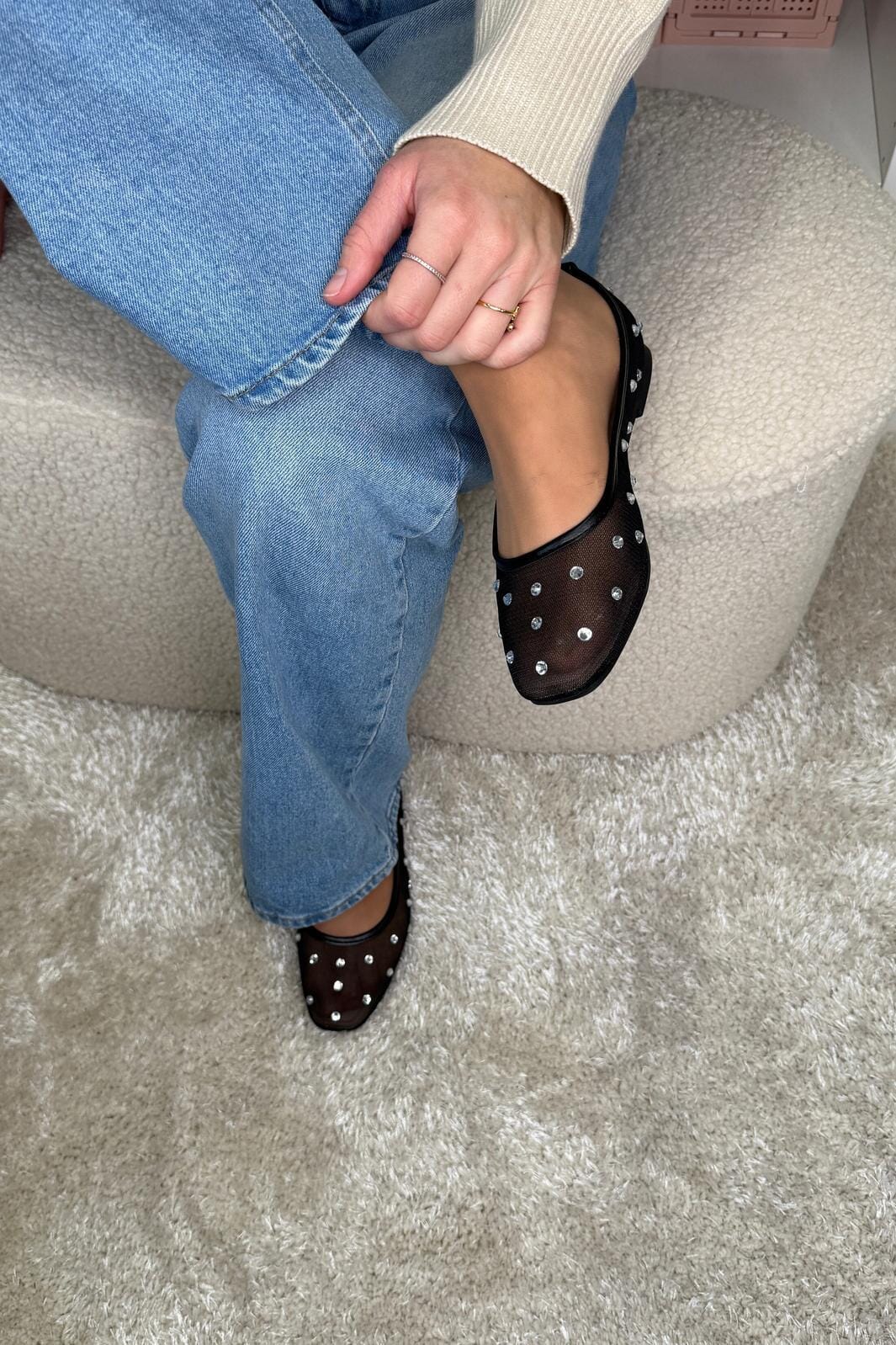 Czarne baleriny od Bloom z siateczkowym wierzchem. Buty mają ozdobne kamienie w wzorze w kropki i niski obcas, co ułatwia poruszanie się.