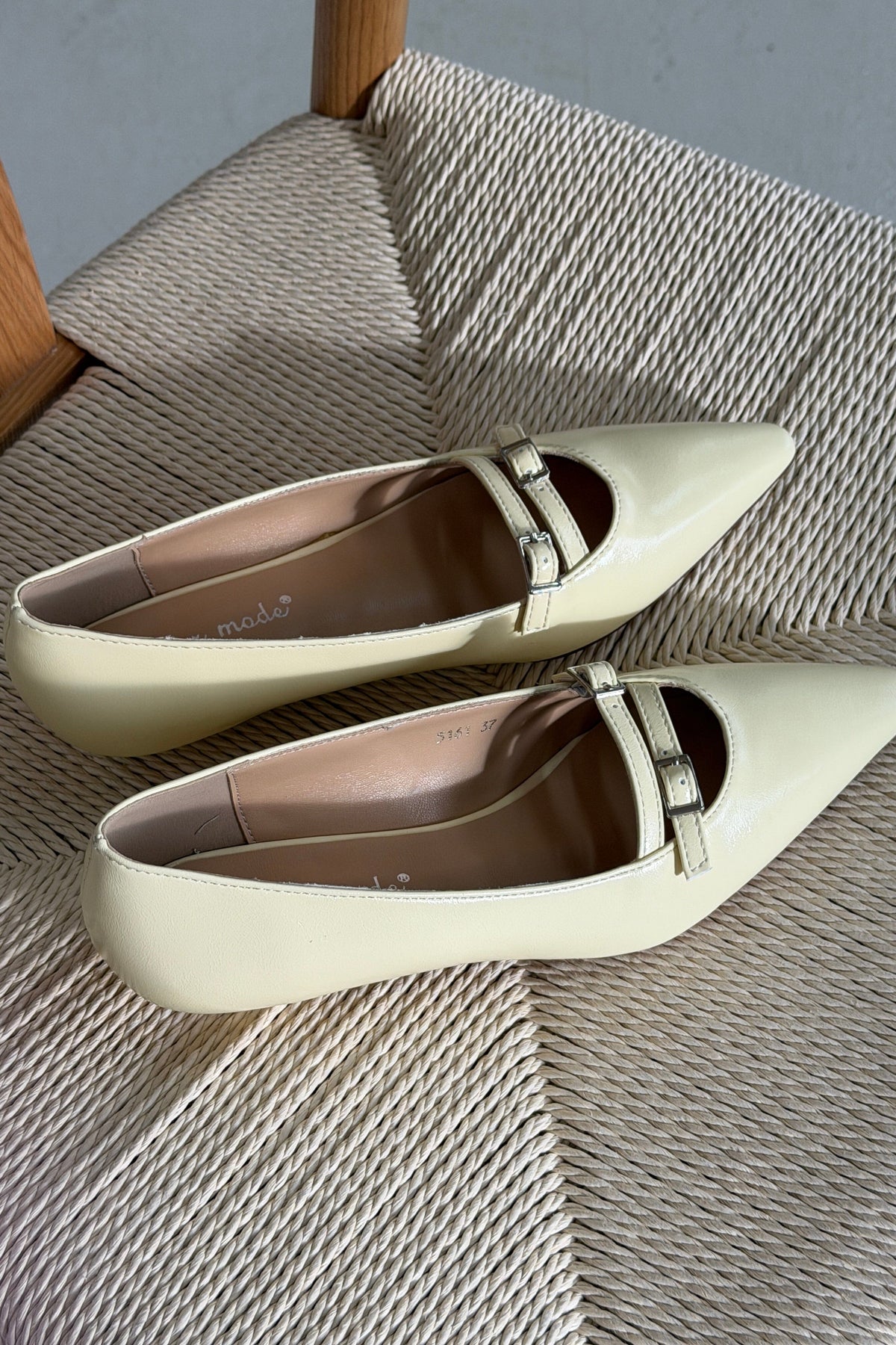 Jasnożółte baleriny Bloom z ostrym noskiem i ozdobnym paskiem z klamrą. Buty wykonane są z materiału syntetycznego.