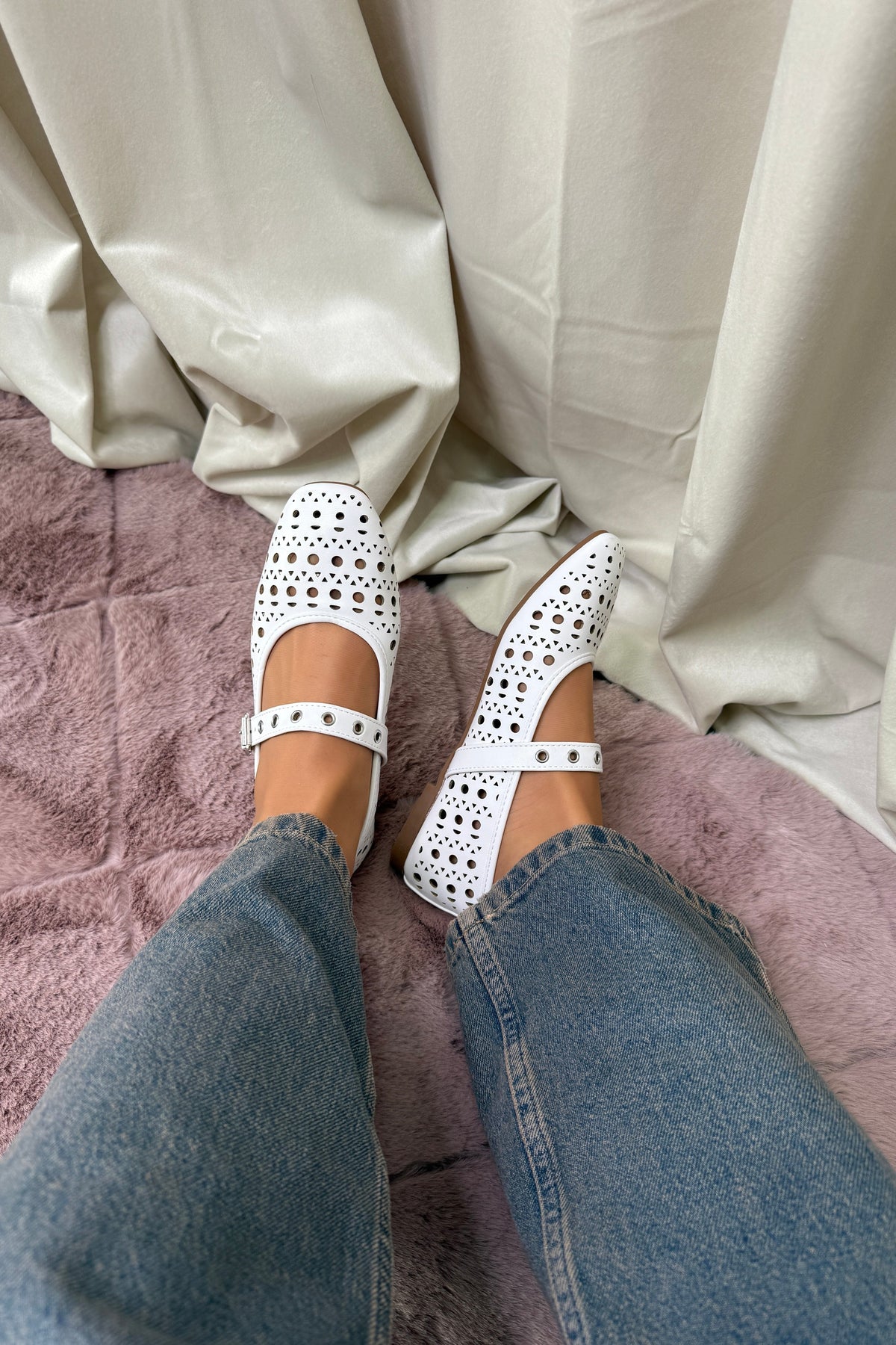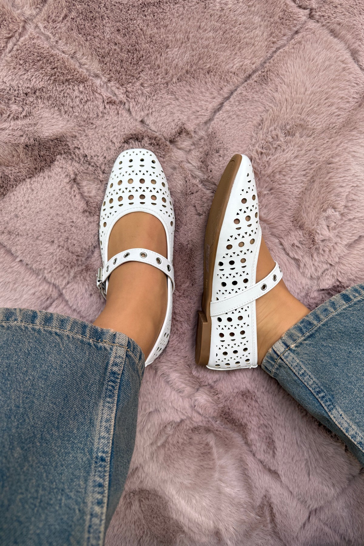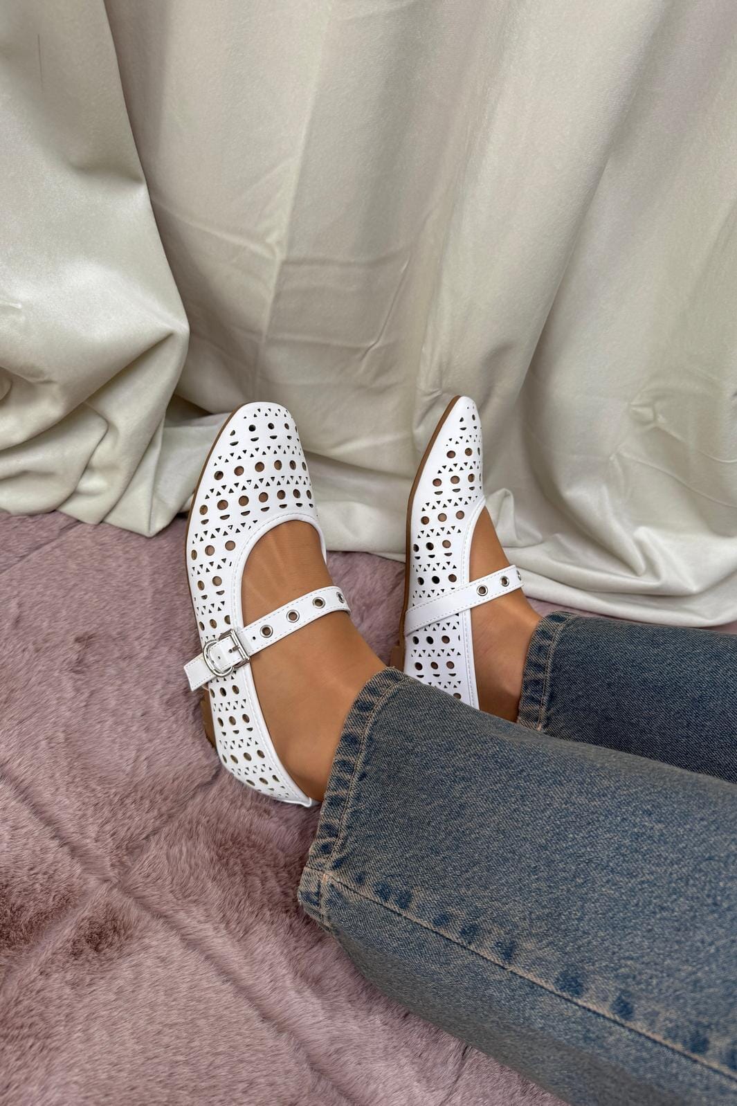 Białe buty od Bloom z wyciętym wzorem w górnej części. But ma kwadratowy czubek i zapięcie na klamrę nad kostką. Płaski obcas i lekkie wzornictwo sprawiają, że jest wygodny w noszeniu.