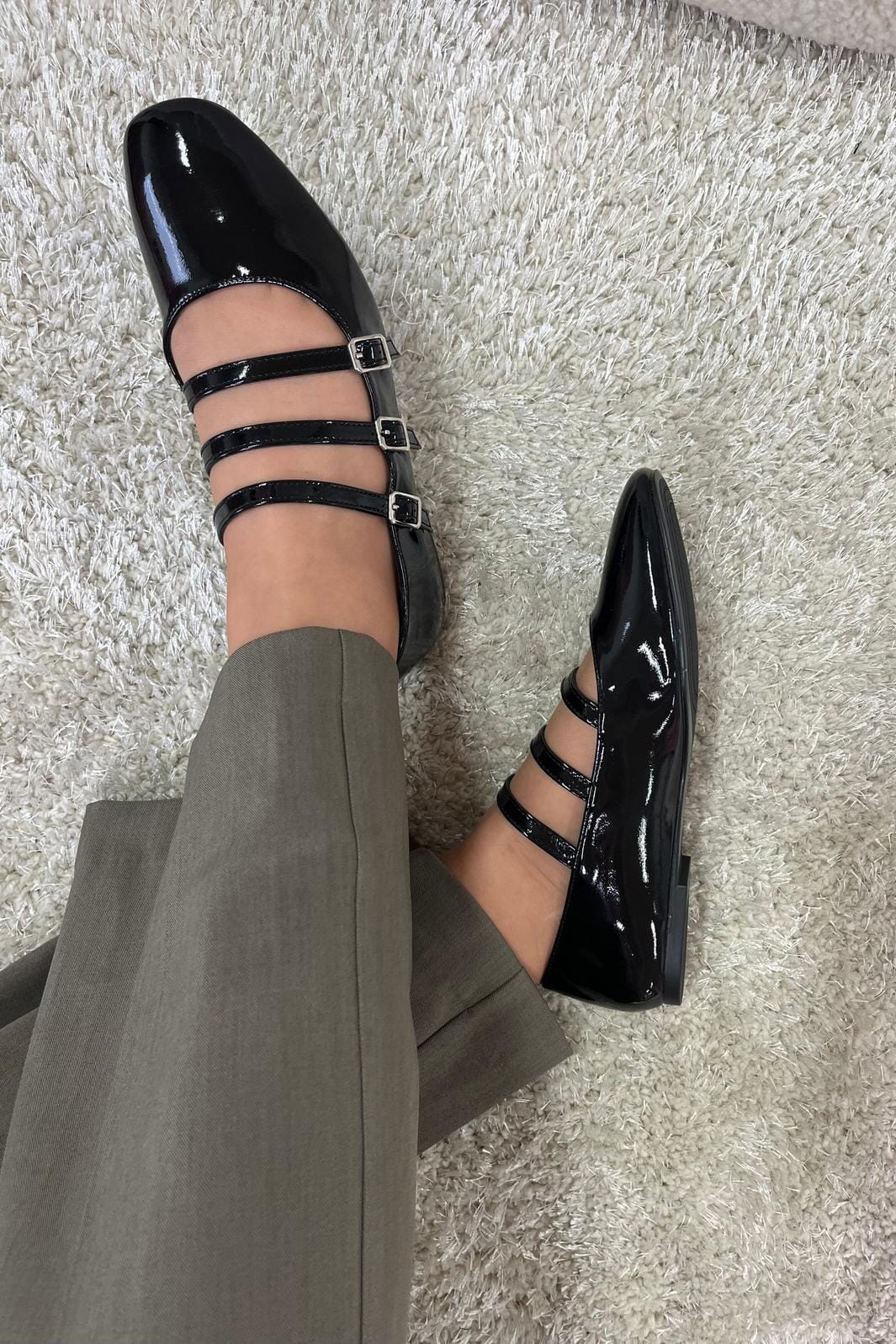 Czarne lakierowane buty z trzema klamrami od Bloom. Spiczasty czubek i wąskie paski nadają butom klasyczny wygląd, który pasuje zarówno na uroczystości, jak i formalne okazje.