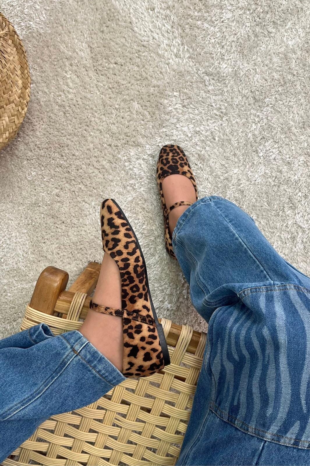 Baleriny od Bloom w leopardskim wzorze w brązowych i czarnych odcieniach. But ma migdałowy czubek i praktyczne zapięcie na klamrę nad kostką.