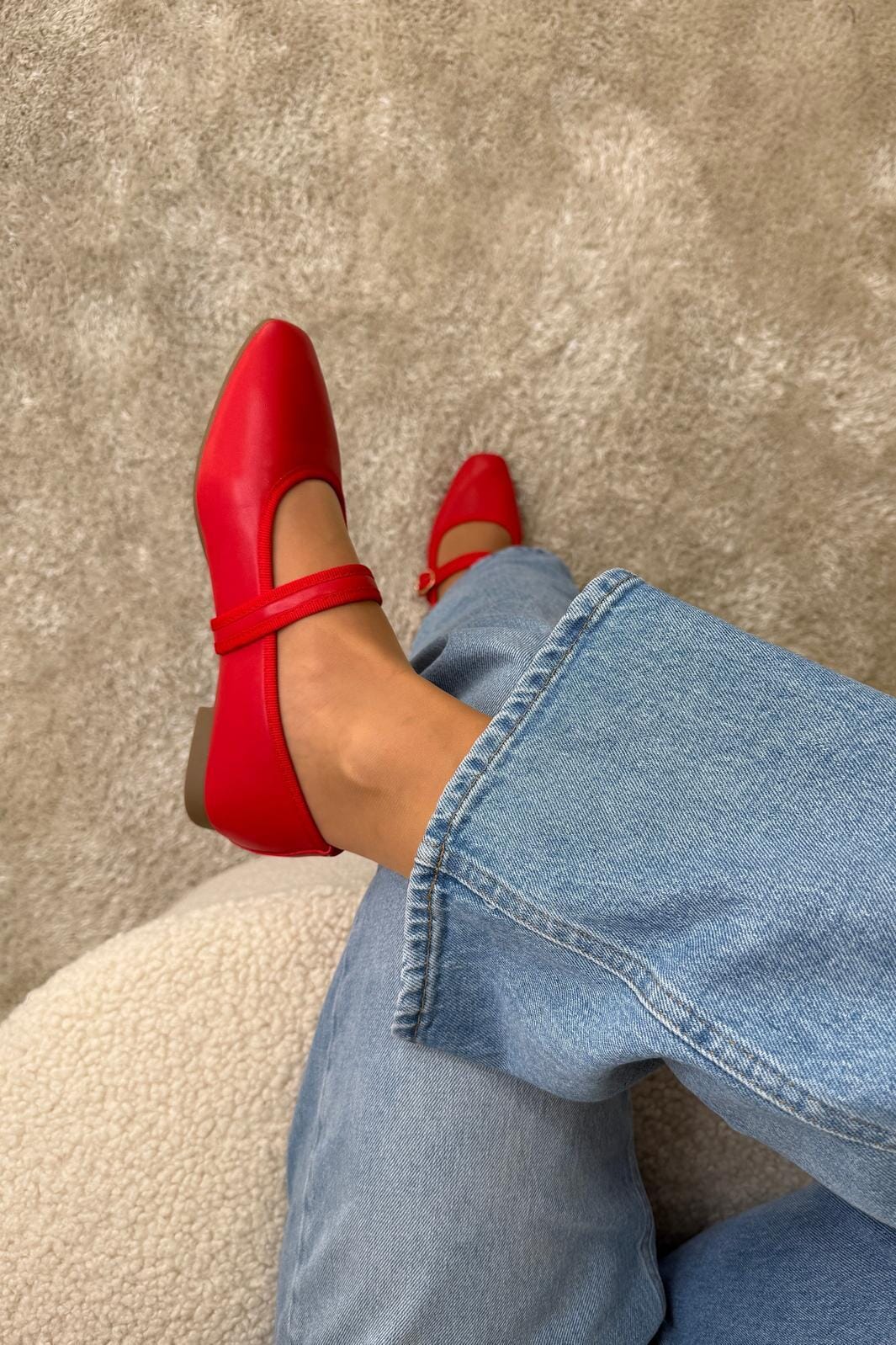 Czerwona ballerina od Bloom z paskiem Mary Jane. Czerwony kolor wyraźnie się wyróżnia, a but ma okrągły czubek z paskiem nad kostką.
