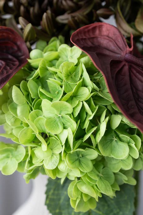 Bukiet od Bloom Objects z zielonymi chryzantemami, ciemnozielonym amarantusem i bordową anturią. Bukiet wykonany jest z lateksu, co zapewnia naturalny wygląd.