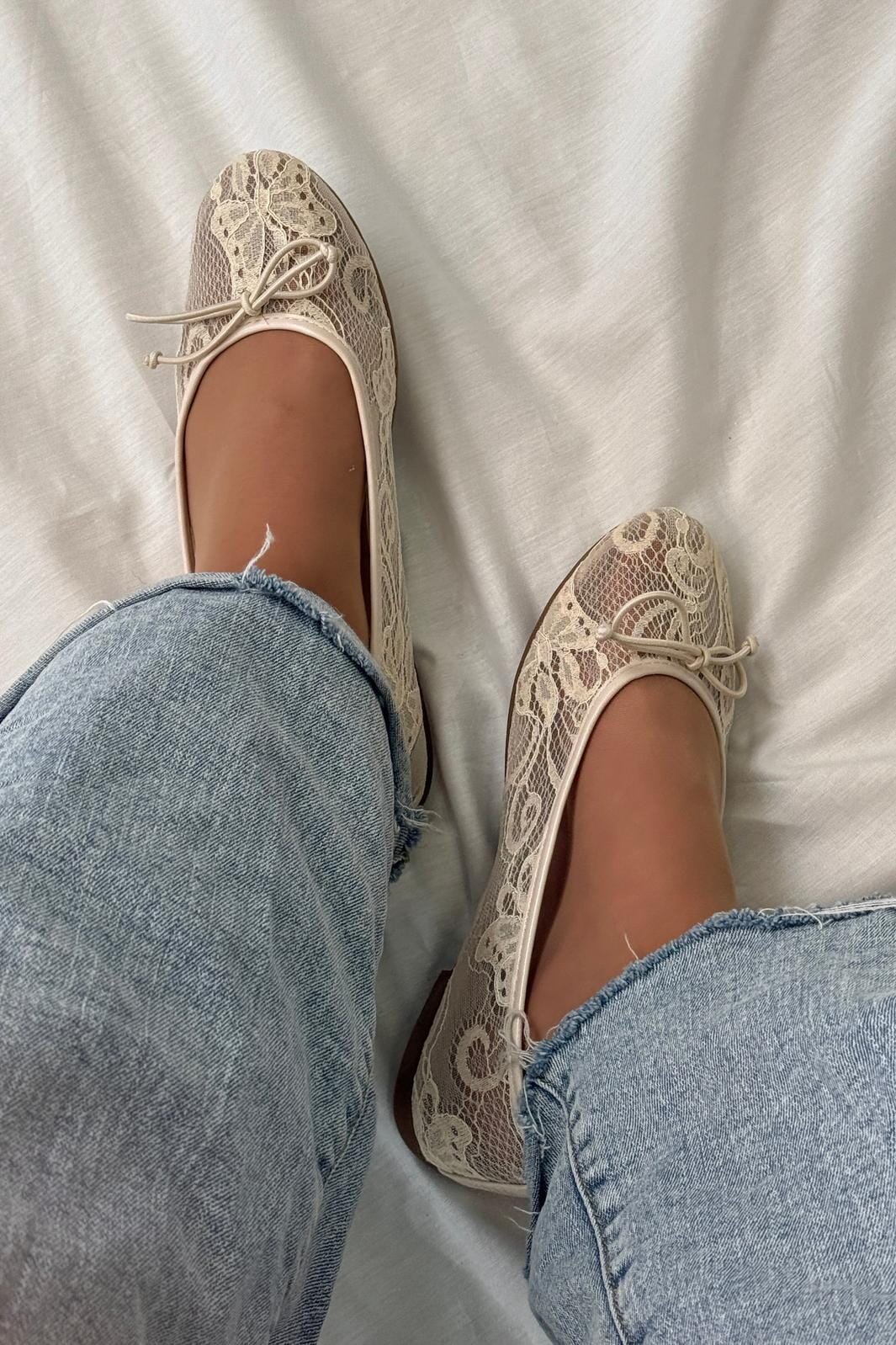 Beżowe baleriny od Bloom z koronkową powierzchnią i detalem w postaci kokardy. Buty mają niski obcas i są zaprojektowane na formalne okazje, takie jak wesela i przyjęcia.