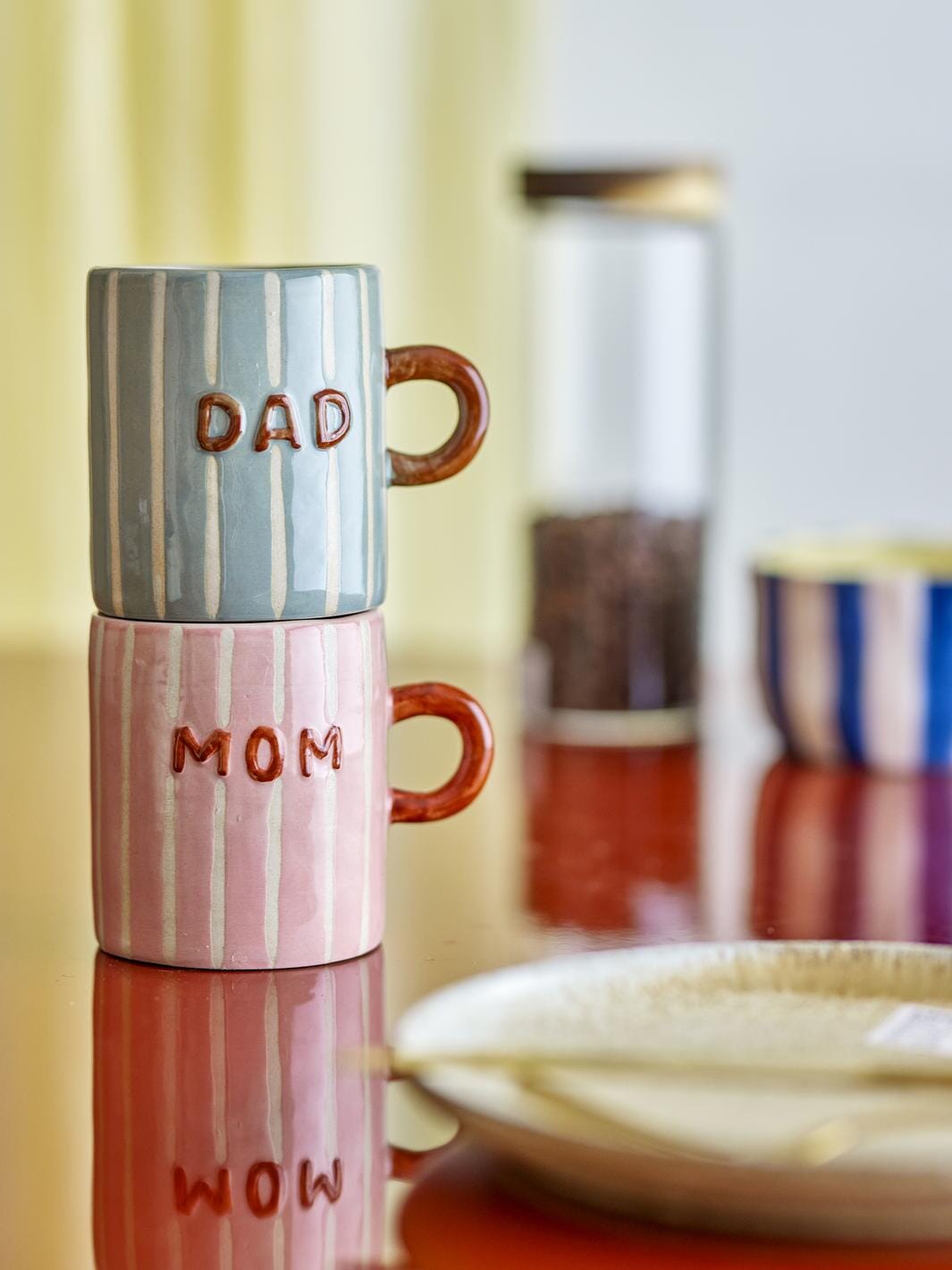 Różowy kubek Bloomingville z kamionki z ręcznie malowanymi pionowymi kremowymi paskami. Napis MOM jest nadrukowany po obu stronach, a ucho ma ciemny terakotowy kolor.