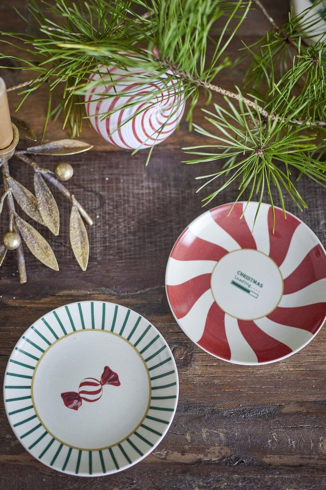 Talerze świąteczne od Bloomingville z kamionki z czerwonym spiralnym wzorem i zielonymi paskami. Dwa różne wzory z motywami świątecznymi na białym tle.